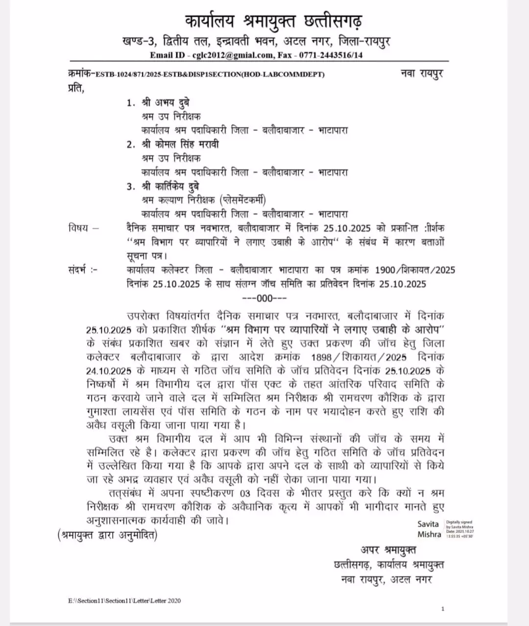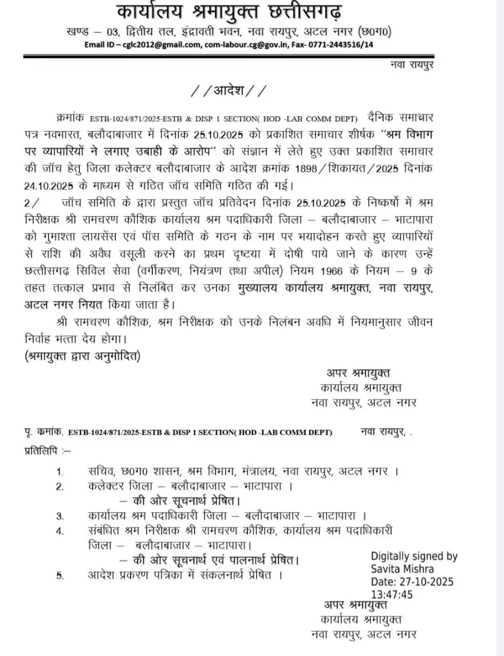 कुश अग्रवाल - बलौदा बाजार। दीपावली के दौरान महिला उत्पीड़न जांच के बहाने व्यापारियों से अवैध वसूली करने वाले श्रम निरीक्षक के खिलाफ प्रशासन ने सख्त कदम उठाया है। भ्रष्टाचार के गंभीर आरोपों के चलते श्रम निरीक्षक रामचरन कौशिक को तत्काल प्रभाव से निलंबित कर दिया गया है। साथ ही, इस प्रकरण में मौके पर मौजूद दो श्रम उप निरीक्षकों और एक श्रम कल्याण उप निरीक्षक (प्लेसमेंट) को भी नोटिस जारी किया गया है और उनसे इस संबंध में स्पष्टीकरण मांगा गया है।
