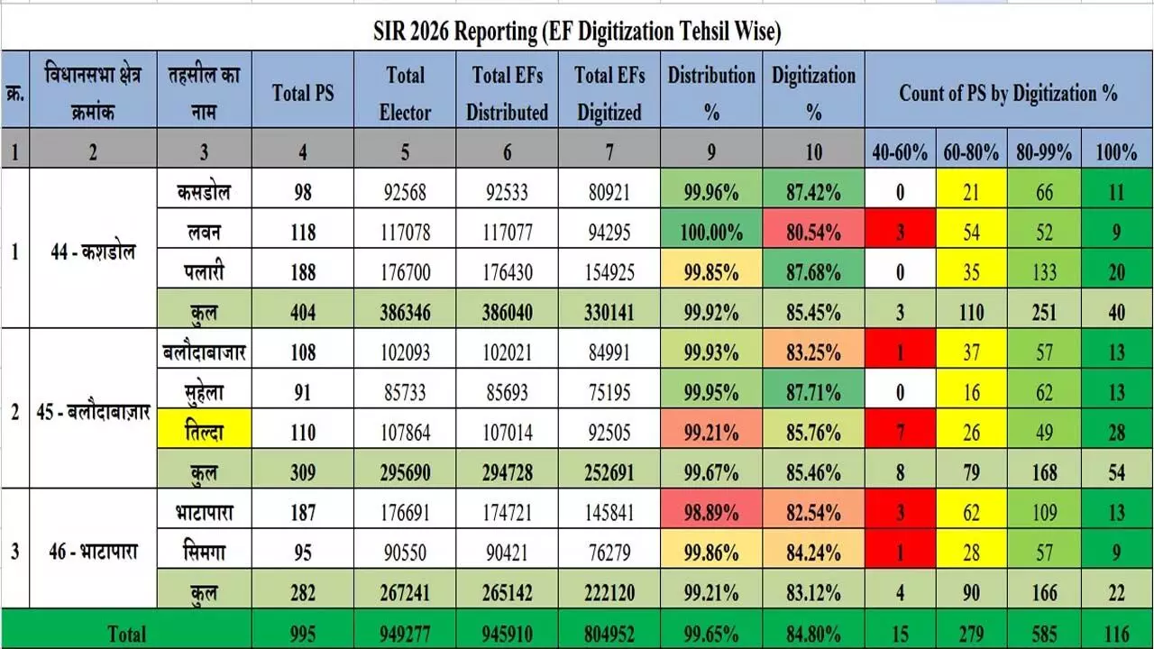 उप जिला निर्वाचन अधिकारी निशा नेताम मड़ावी ने बताया कि जिले के तीनों विधानसभा क्षेत्रों- कसडोल, बलौदा बाजार और भाटापारा में कुल 9,49,277 मतदाता पंजीकृत हैं। इनमें से 9,46,000 से अधिक मतदाताओं तक गणना पत्रक पहुँचाए जा चुके हैं, जबकि 8,45,994 गणना पत्रकों का डिजिटाइजेशन कर लिया गया है।