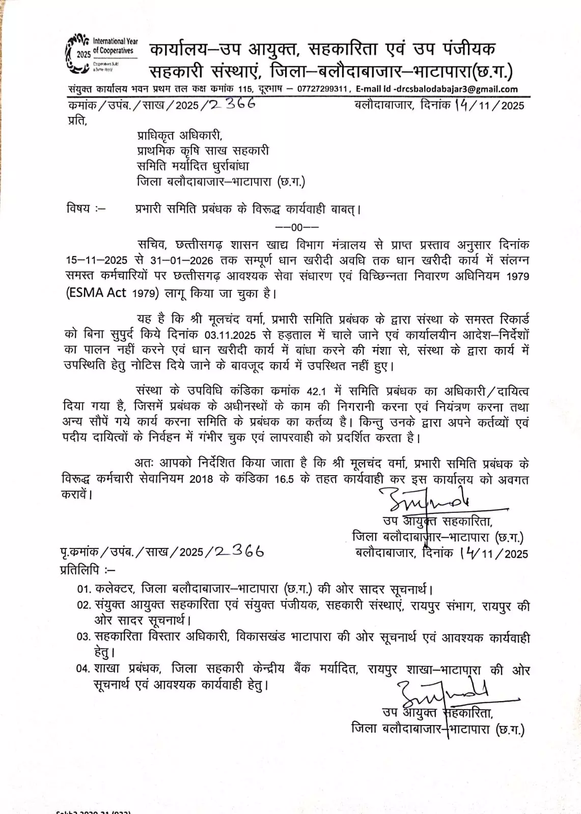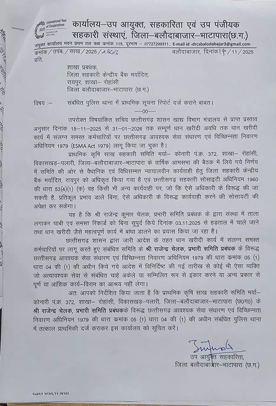 हड़ताल में सक्रिय भूमिका निभाने और धान खरीदी प्रक्रिया को बाधित करने के आरोप में 3 कर्मचारियों के खिलाफ एफआईआर दर्ज कराने के लिए पत्र जारी किया गया है।