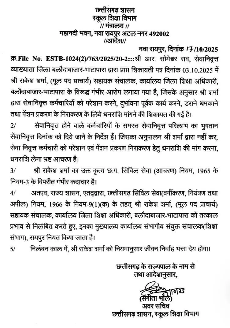 कुश अग्रवाल- बलौदाबाजार। छत्तीसगढ़ शासन ने जिला शिक्षा अधिकारी कार्यालय में पदस्थ सहायक संचालक राकेश शर्मा को रिश्वत मांगने और सेवानिवृत्त कर्मचारी को प्रताड़ित करने के आरोप में तत्काल प्रभाव से निलंबित कर दिया है। यह कार्रवाई सेवानिवृत्त व्याख्याता आर. सोमेश्वर राव द्वारा दर्ज कराई गई शिकायत के आधार पर की गई है।