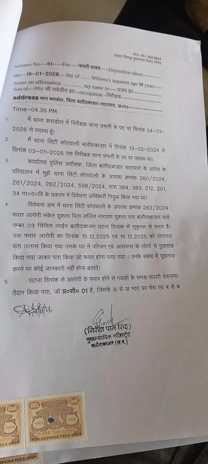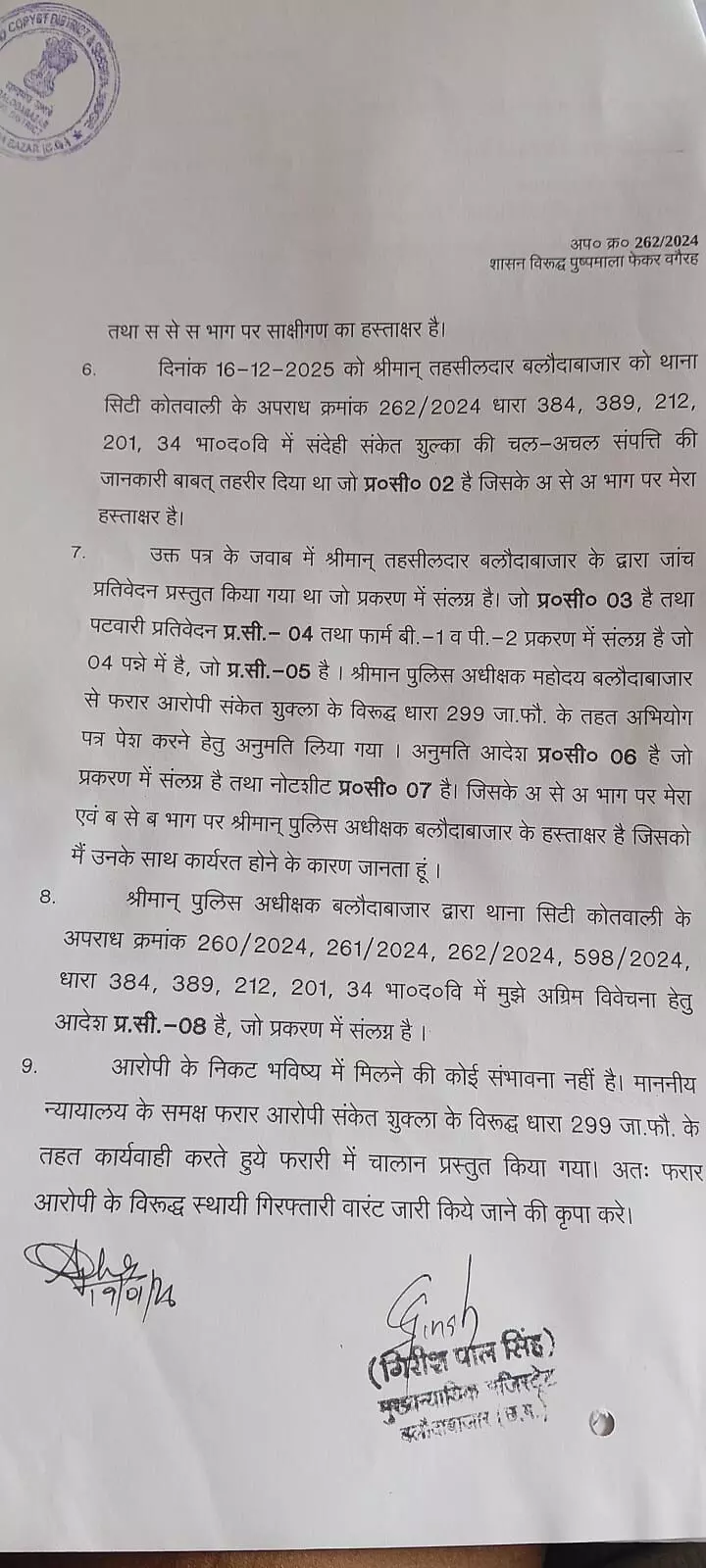 इस पूरे मामले में एक और अहम मोड़ तब सामने आया, जब बलौदा बाजार पुलिस ने सेक्सटॉर्शन प्रकरण में जिला सत्र न्यायालय में अनुपूरक चालान पेश किया। चालान में आरोपी संकेत शुक्ला को फरार घोषित करते हुए न्यायालय में बाकायदा हलफनामा भी प्रस्तुत किया गया।