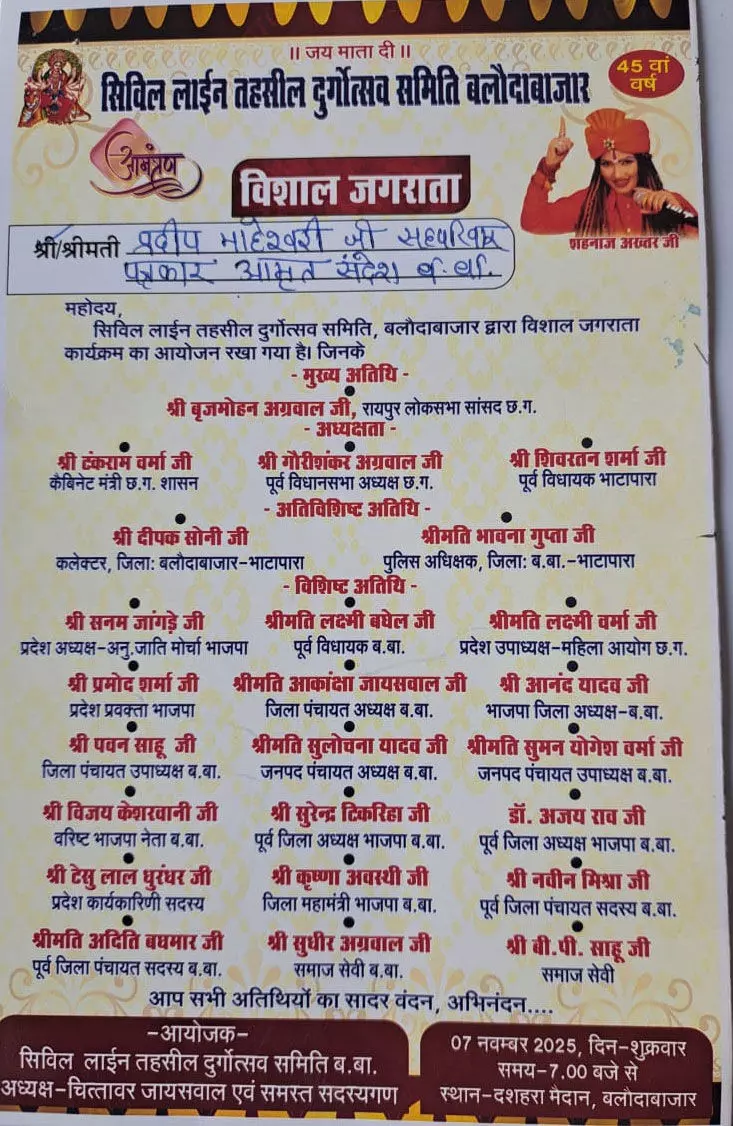 स्थानीय सिविल लाइन दुर्गोत्सव समिति ने 7 नवंबर को जगराता और भजन संध्या का आयोजन किया गया था। इस कार्यक्रम में देश की प्रसिद्ध भजन गायक शहनाज़ अख्तर ने अपनी सुमधुर आवाज़ से श्रोताओं को मंत्रमुग्ध कर दिया। आयोजन की तैयारियाँ करीब एक महीने से लगातार चल रही थीं। मंच, पंडाल, लाइटिंग और सुरक्षा के व्यापक इंतज़ाम किए गए थे।