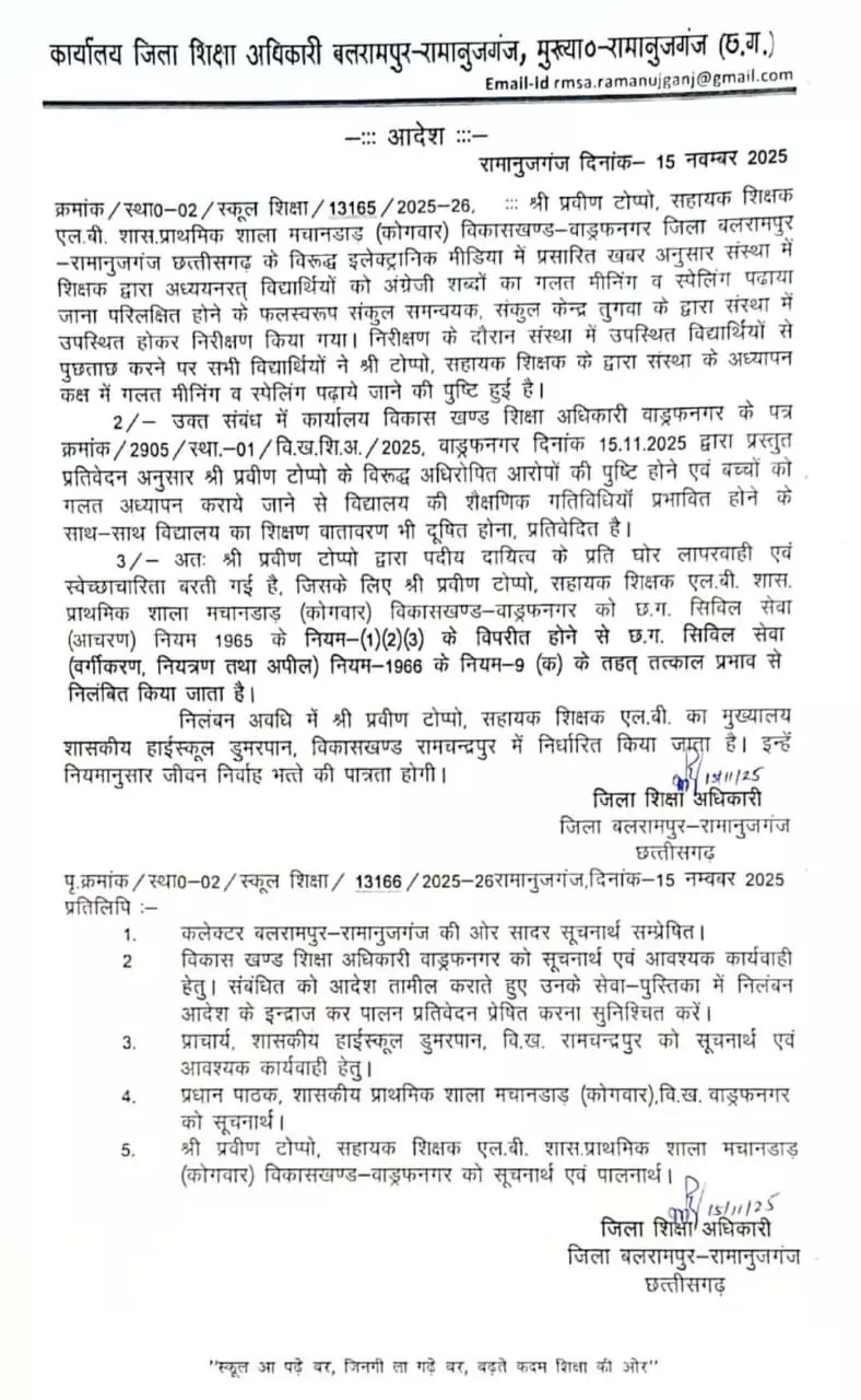 कृष्ण कुमार यादव- बलरामपुर। शिक्षा की गुणवत्ता पर सवाल खड़े करने वाले एक गंभीर मामले में बलरामपुर जिले के वाड्रफनगर विकासखंड के कोगवार गांव स्थित मचानडांड स्कूल के शिक्षक को निलंबित कर दिया गया है।