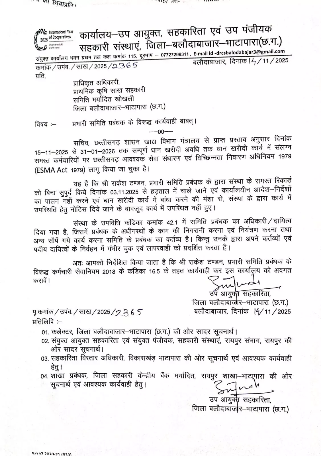बलौदाबाजार में धान खरीदी हड़ताल पर कड़ा एक्शन