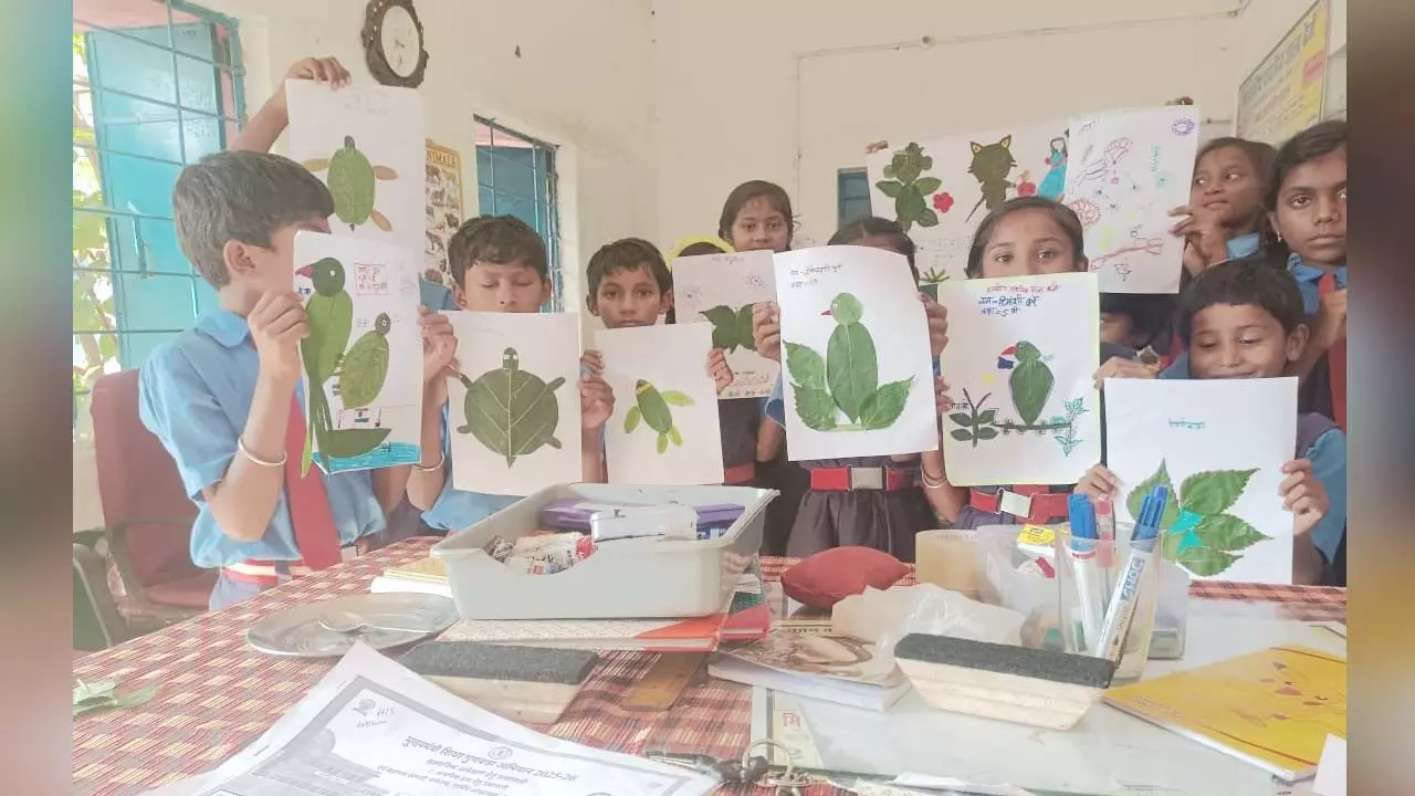 स्कूली बच्चों ने पत्तों से बनाई विभिन्न आकृतियां