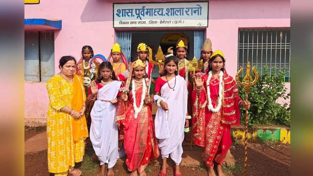 बेमेतरा। बेमेतरा जिले के शासकीय पूर्व माध्यमिक शाला रानो में बच्चों ने नौ दुर्गा के रूप में शानदार प्रस्तुति दी। बच्चों ने प्रथम दिन माँ शैलपुत्री से लेकर ब्रह्मचारिणी, चन्द्रघण्टा, कुष्मान्डा, स्कन्द माता, कात्यायनी, कालरात्रि, महागौरी नवमी दिन माँ सिद्धि दात्री तक के सारे रूपों को बहुत ही अच्छे से प्रस्तुत किया। साथ ही साथ अपनी विशेषता भी बताई।