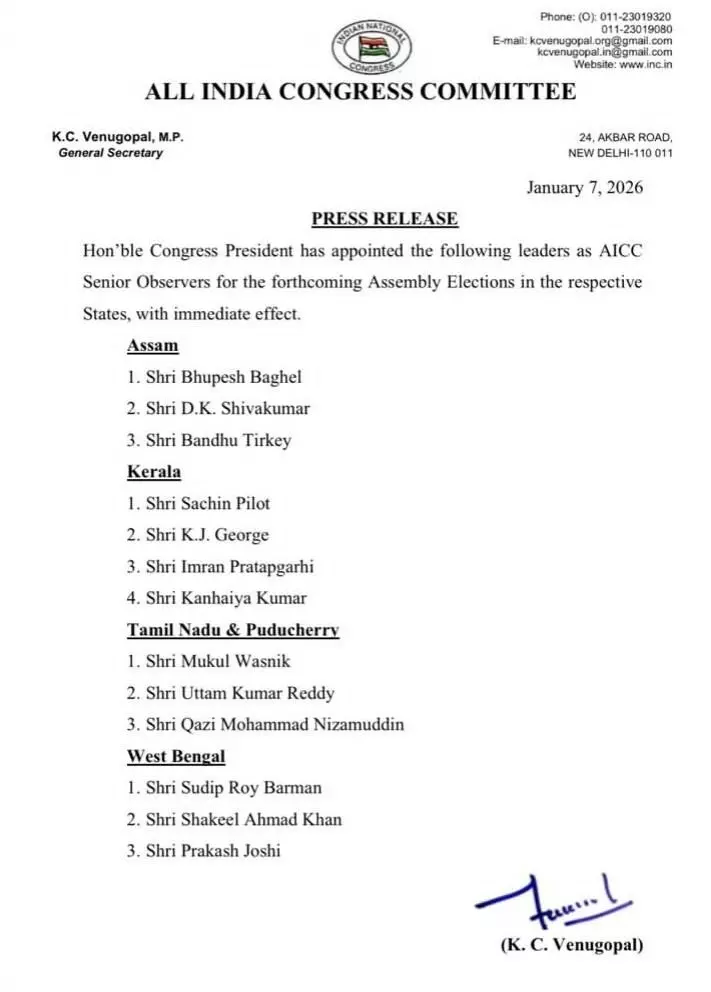 असम के लिए वरिष्ठ पर्यवेक्षक के रूप में छत्तीसगढ़ के पूर्व मुख्यमंत्री भूपेश बघेल, कर्नाटक के उप मुख्यमंत्री डी.के. शिवकुमार और झारखंड के वरिष्ठ नेताओं नेता बंधु तिर्की को जिम्मेदारी दी है। वहीं केरल में चुनावी रणनीति और संगठनात्मक समन्वय की जिम्मेदारी छत्तीसगढ़ प्रभारी सचिन पायलट, के.जे. जॉर्ज, राज्यसभा सांसद इमरान प्रतापगढ़ी और बिहार के युवा नेता कन्हैया कुमार को सौंपी गई है।