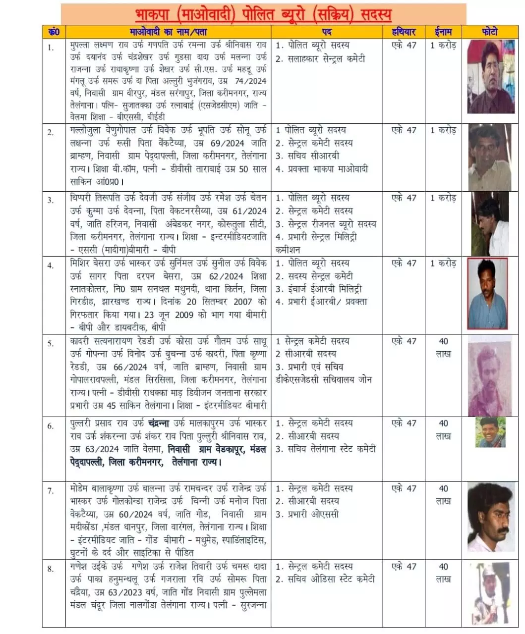 नक्सल नेता सोनू उर्फ भूपति को मल्लोजुला वेणुगोपाल उर्फ विवेक उर्फ भूपति उर्फ सोनू उर्फ लक्षन्ना उर्फ रूसी के नाम भी जाना जाता है। पिता वेंकटैय्या, उम्र 69/2024 जाति ब्राम्हण, निवासी ग्राम पेद्दापल्ली, जिला करीमनगर, तेलंगाना राज्य। शिक्षा बी. कॉम, पत्नी डीवीसी ताराबाई उम्र 50 साल साकिन आंध्रप्रदेश।