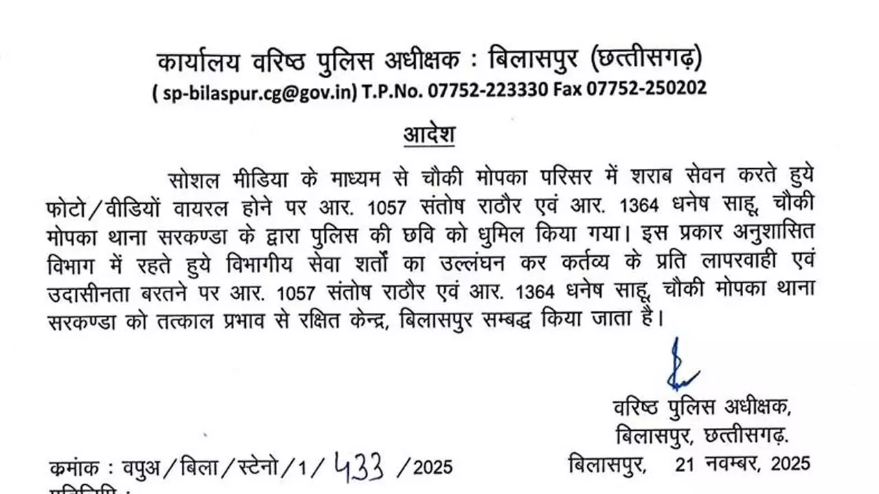 उल्लेखनीय है कि, सोशल मीडिया के माध्यम से चौकी मोपका परिसर में शराब पीते हुये फोटो/वीडियों वायरल होने पर आरक्षक 1057 संतोष राठौर, आरक्षक 1364 धनेष साहू, चौकी मोपका थाना सरकण्डा के द्वारा पुलिस की छवि को धूमिल किया गया। इस प्रकार अनुशासित विभाग में रहते हुये विभागीय सेवा शर्तों का उल्लंघन कर कर्तव्य के प्रति लापरवाही एवं उदासीनता बरतने पर संतोष राठौर, धनेष साहू, चौकी मोपका थाना सरकण्डा को तत्काल प्रभाव से रक्षित केन्द्र, बिलासपुर सम्बद्ध किया जाता है।