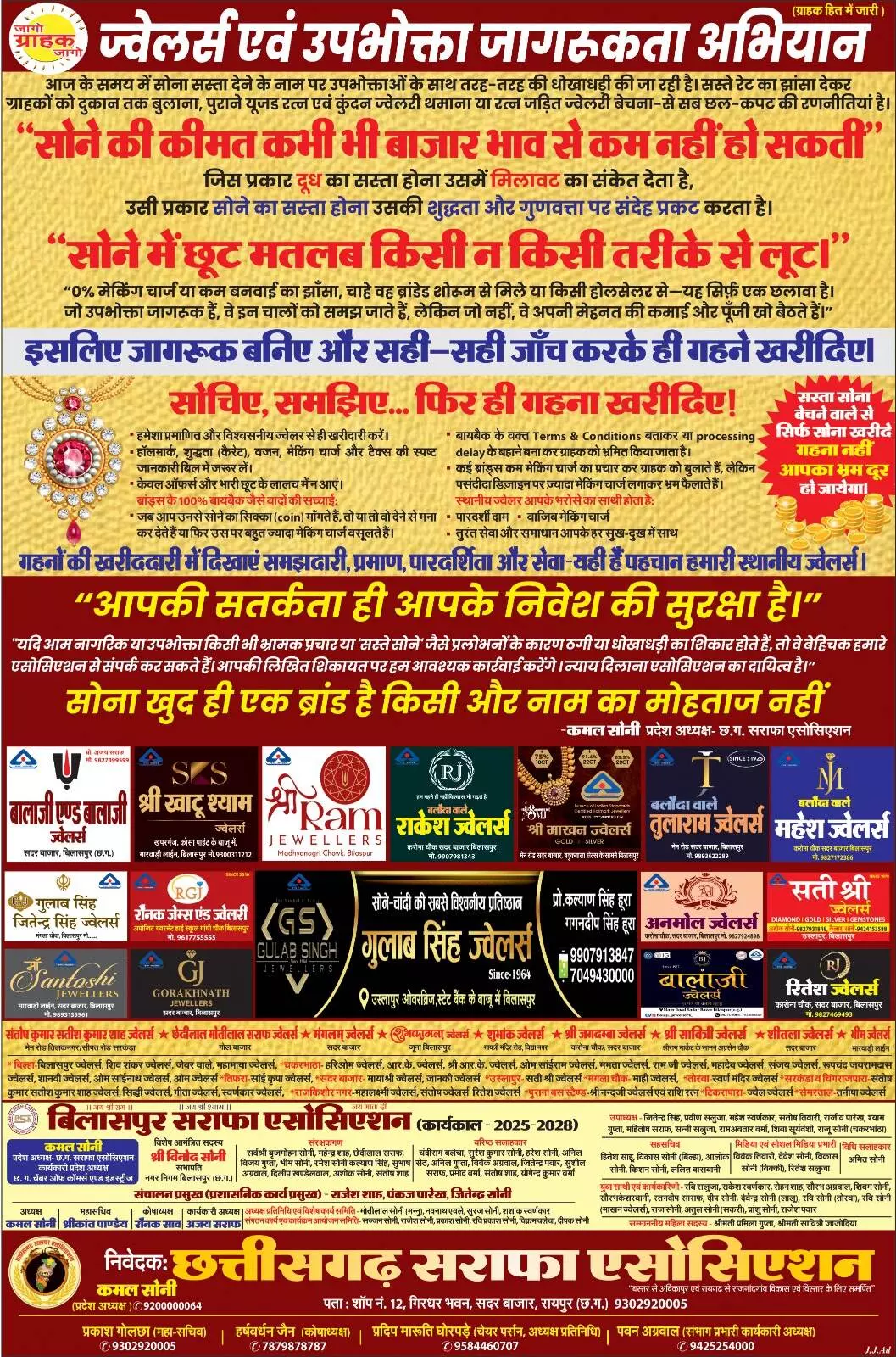 पंकज गुप्ते- बिलासपुर। दीपापाली और धनतेरस जैसे बड़े त्योहारों की आहट के साथ सराफा बाजारों में रौनक बढ़ने लगी है। शो-रूम्स में भीड़, ऑफर्स की बाढ़ और चमचमाते गहनों के बीच अब ठगी के नए तरीके भी सामने आने लगे हैं। इसी बढ़ती अनियमतीता पर रोक लगाने और ग्राहकों को सचेत करने के लिए छत्तीसगढ़ सराफा एसोसिएशन ने मुहीम शुरू की है।