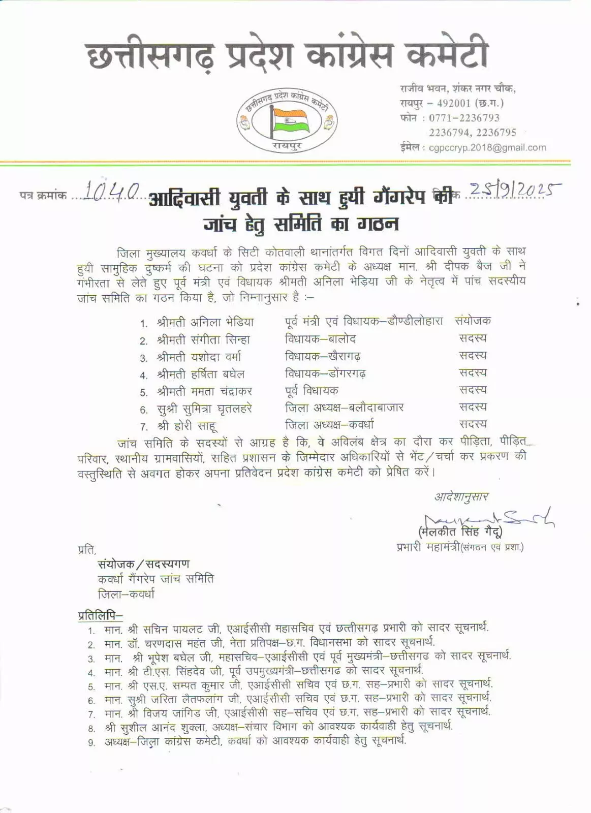 संजय यादव- कवर्धा। छत्तीसगढ़ के कवर्धा जिले में आदिवासी छात्रा के साथ हुए सामूहिक दुष्कर्म की घटना ने पूरे क्षेत्र को झकझोर कर रख दिया है। वहीं अब मामले में कांग्रेस कमेटी ने जांच समिति गठित की है। मामले में प्रदेश अध्यक्ष दीपक बैज ने सात सदस्यीय टीम बनाकर जांच करने निर्देश दिए। कमेटी में पूर्व मंत्री अनिला भेड़िया समेत विधायक, पूर्व विधायक और जिला अध्यक्ष का नाम शामिल हैं।