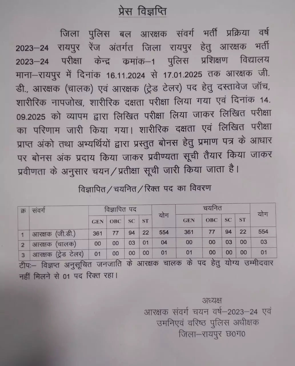 रायपुर रेंज में जिले के लिए आयोजित आरक्षक भर्ती परीक्षा के परिणाम घोषित कर दिए गए हैं। 559 पदों के लिए परीक्षा हुई थी। जिसमें 558 अभ्यर्थियों का चयन हुआ हैं।