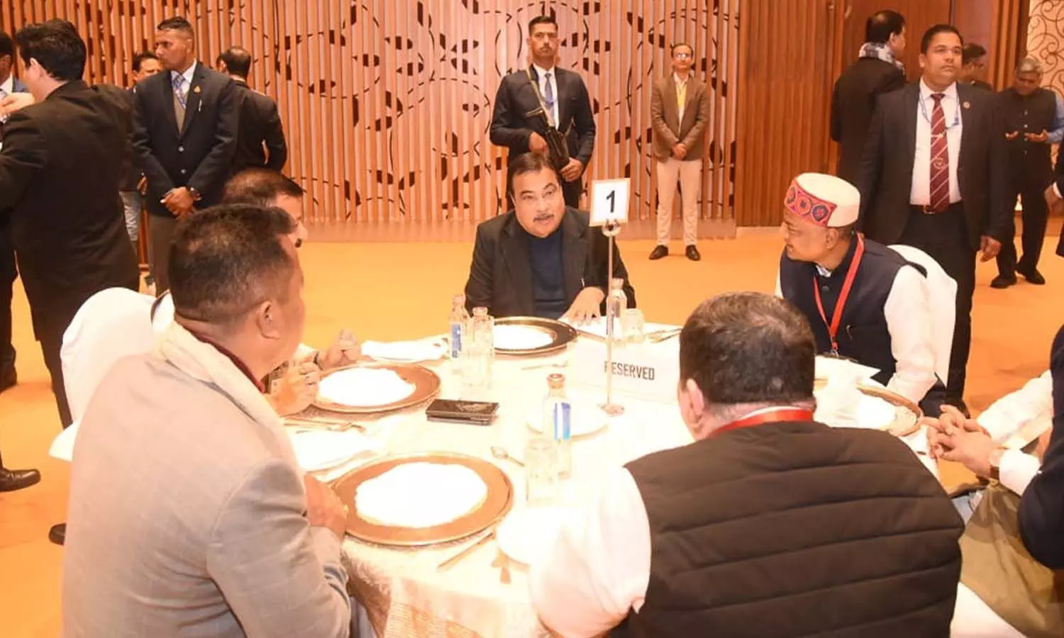 परिवहन मंत्री केदार कश्यप और केंद्रीय मंत्री नितिन गडकरी आपस में बात करते हुए