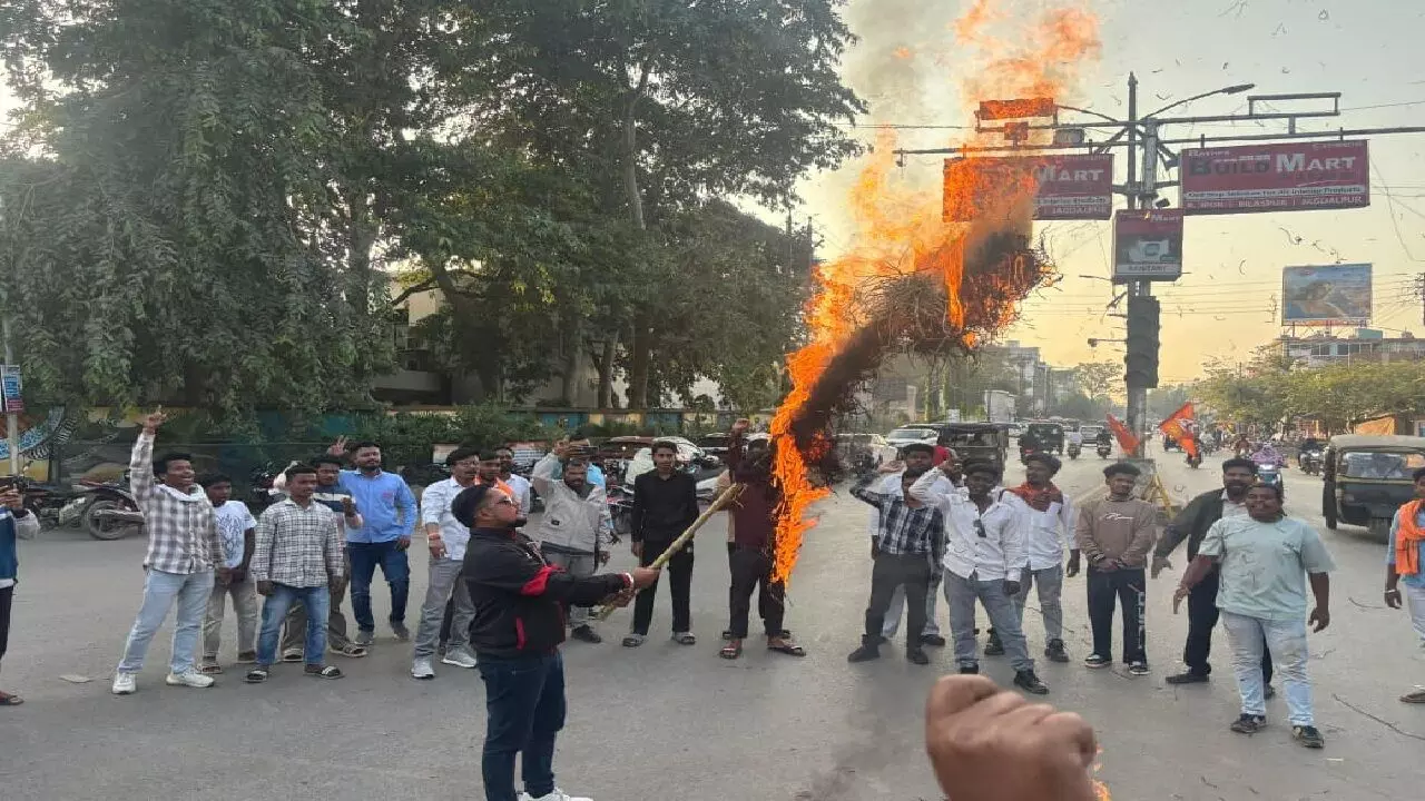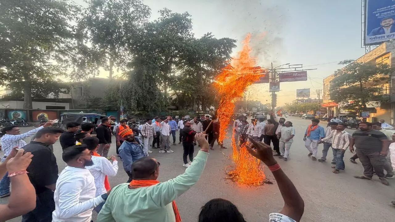 पुतला दहन करते विहिप-बजरंग दल के कार्यकर्ता