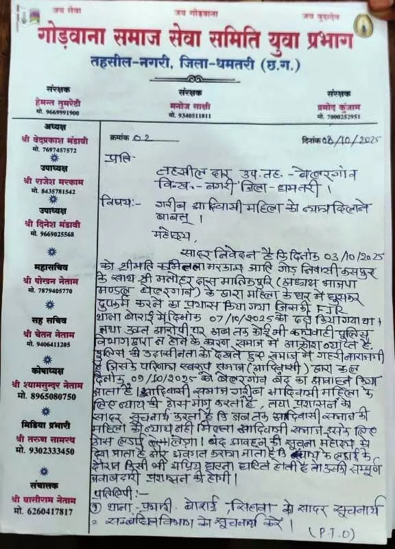गोपी कश्यप- नगरी। छत्तीसगढ़ के धमतरी जिले में गोड़वाना समाज सेवा समिति युवा प्रभाग नगरी ने 8 अक्टूबर को तहसीलदार को ज्ञापन सौंपा है। 3 अक्टूबर को एक महिला के साथ मनोहर दास मानिकपुरी (अध्यक्ष भाजपा मंडल बेलरगांव) पर छेड़छाड़ और दुष्कर्म का आरोप लगा है। जिसका समाज ने ज्ञापन में उल्लेख करते हुए आरोपियों पर कठोर कार्रवाई की मांग की है।