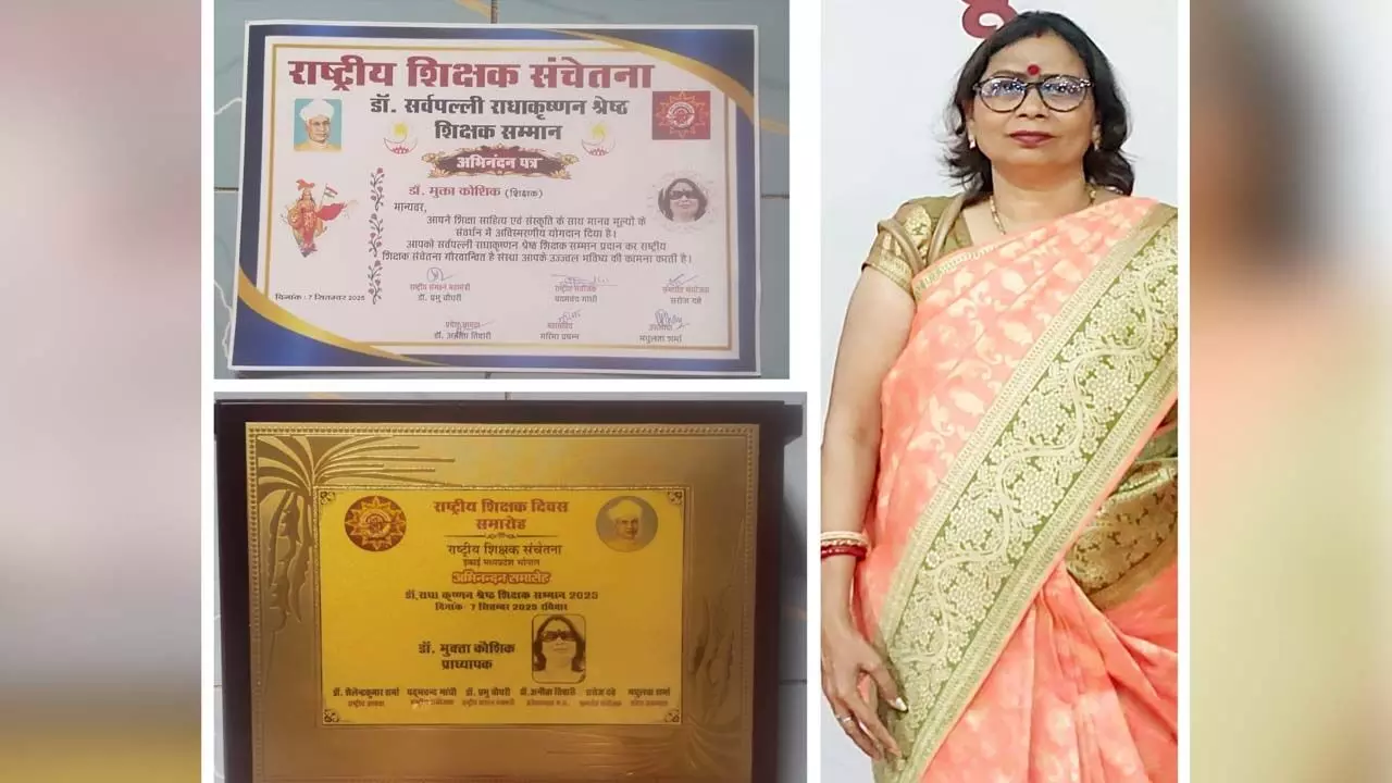 राष्ट्रीय शिक्षक संचेतना की राष्ट्रीय संयोजक मध्य प्रदेश प्रभारी डॉ. मुक्ता कौशिक प्राध्यापिका, ग्रेसियस कॉलेज ऑफ़ एजुकेशन ,रायपुर को श्रेष्ठ शिक्षक सम्मान गांधी भवन भोपाल में स्मृति चिन्ह एवं अभिनंदन पत्र देकर अतिथियों के द्वारा सम्मानित किया गया। समारोह के मुख्य अतिथि महेश सक्सेना वरिष्ठ बाल साहित्यकार , मुख्य वक्ता पदमचंद गांधी जयपुर, अध्यक्षता राष्ट्रीय शिक्षक संचेतना के महासचिव डॉ प्रभु जी चौधरी रहे।