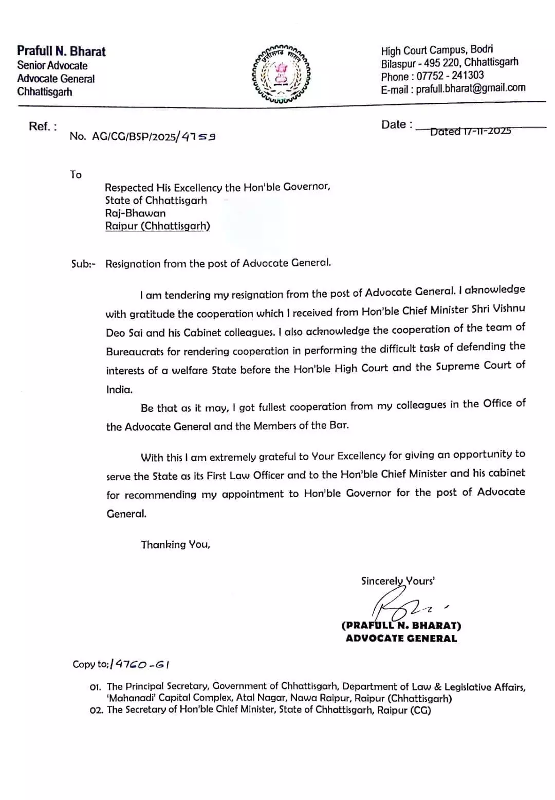 हाईकोर्ट के महाधिवक्ता भारत का इस्तीफा: राज्यपाल को भेजा पत्र, सीएम साय और कैबिनेट का जताया आभार