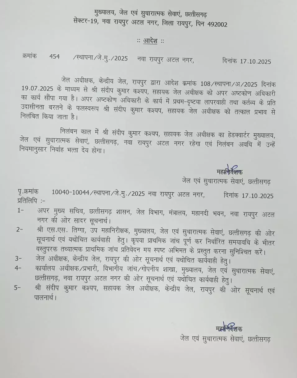जेल में वीडियो कॉल, फोटो शूट: रायपुर सेंट्रल जेल का सहायक अधीक्षक निलंबित