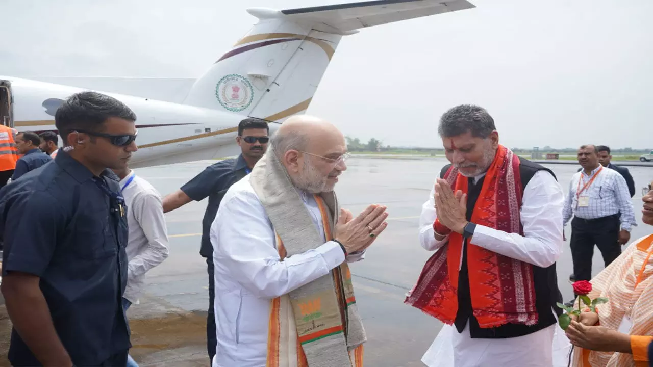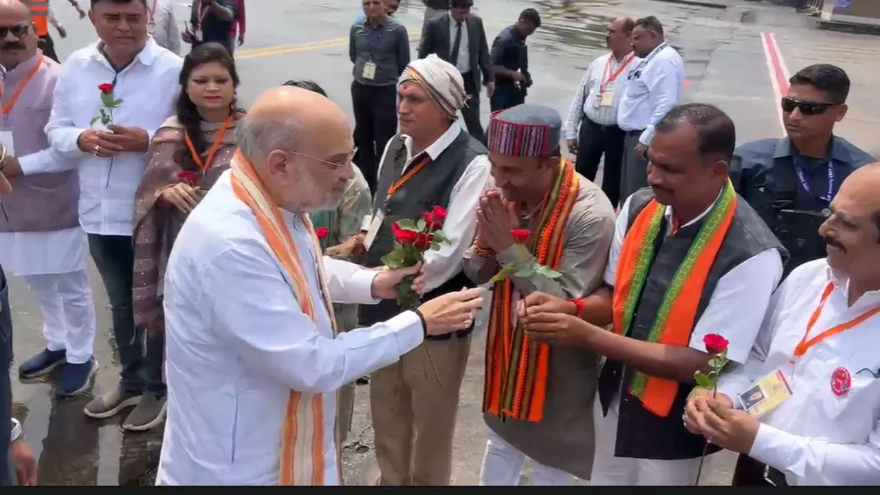 केन्द्रीय गृहमंत्री अमित शाह का एयरपोर्ट पर स्वागत करते हुए मंत्री, नेता और अधिकारी