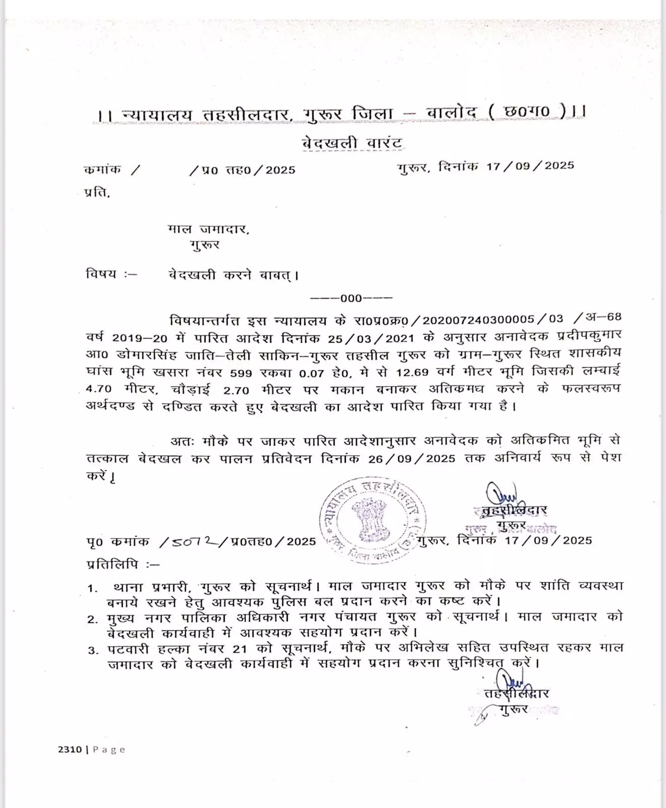मिली जानकारी के अनुसार, अतिक्रमण मामले पर 2021 में आदेश जारी हुआ था। इसके बाद भी अब तक कोई कार्यवाही नहीं की गई है। वहीं अब एक बार फिर मामले में संज्ञान लेते हुए गुरूर तहसीलदार बेदखली वारंट जारी किया है। साथ ही 26 तारीख तक कार्यवाही करने का आदेश है। बता दें कि, नगर पंचायत अध्यक्ष प्रदीप साहू भाजपा के वरिष्ठ कार्यकर्ता हैं।
