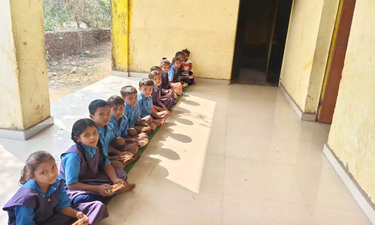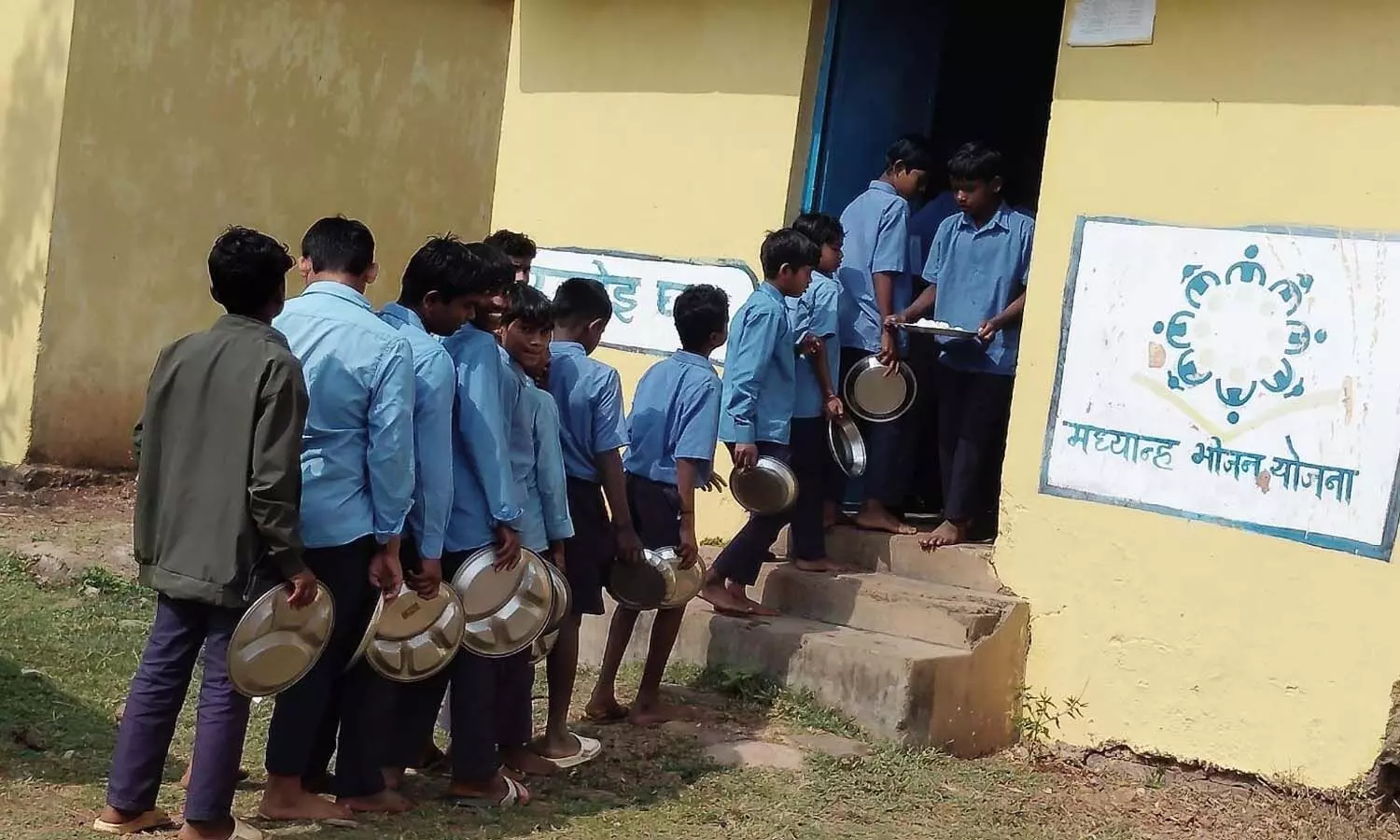 मध्यान्ह भोजन की जगह बच्चों को खाने के लिए बिस्कुट दे रहे