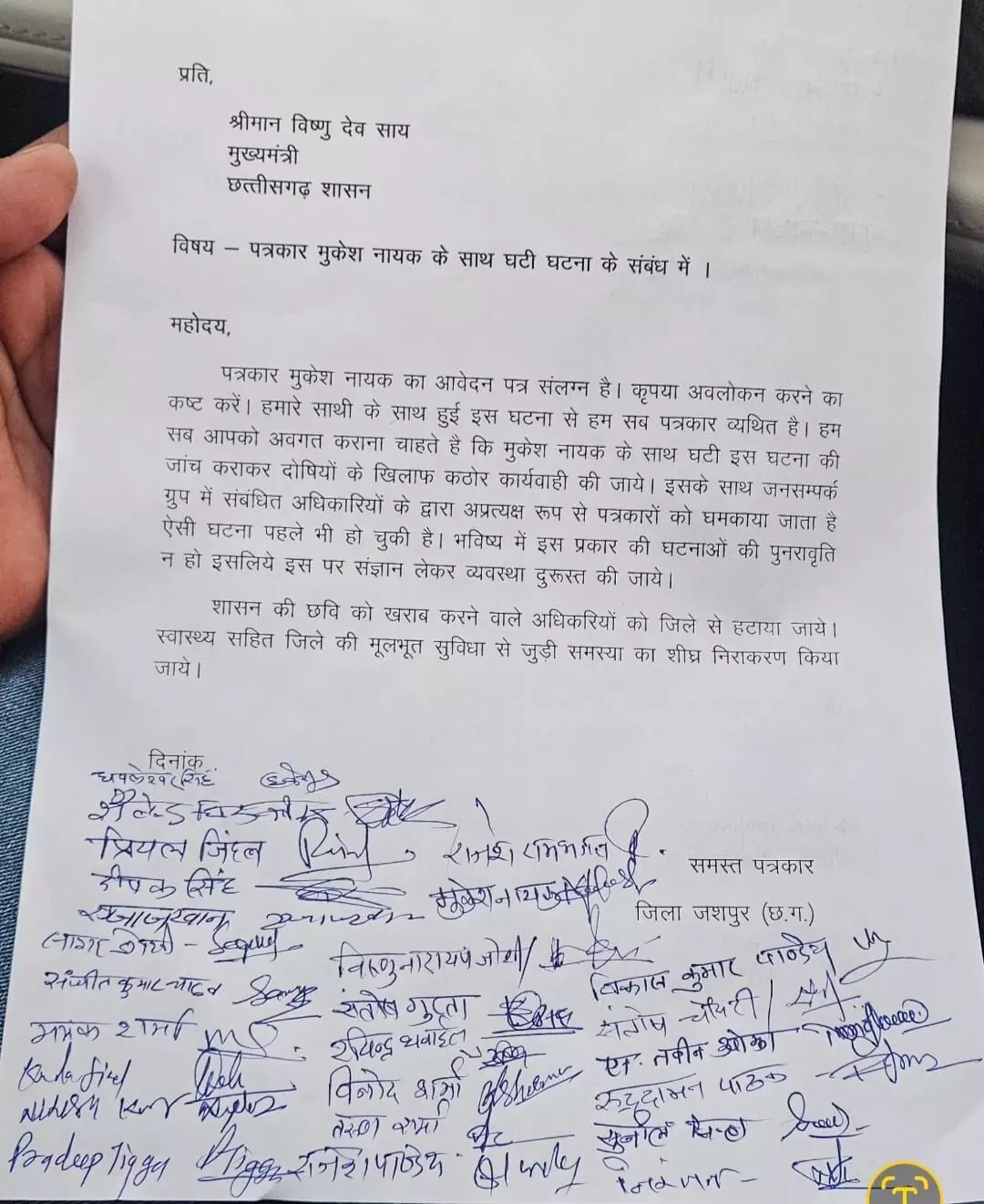 पत्रकार मुकेश नायक के साथ हुए व्यवहार की उच्चस्तरीय और निष्पक्ष जांच। गलत जानकारी प्रसारित करने वाले तथा संवेदनहीन रवैया अपनाने वाले अधिकारियों पर कड़ी कार्रवाई। शासन की छवि खराब करने वाले अधिकारियों को जशपुर जिले से हटाया जाए। स्वास्थ्य सेवाओं और मूलभूत सुविधाओं से जुड़ी समस्याओं का तुरंत समाधान किया जाए।
