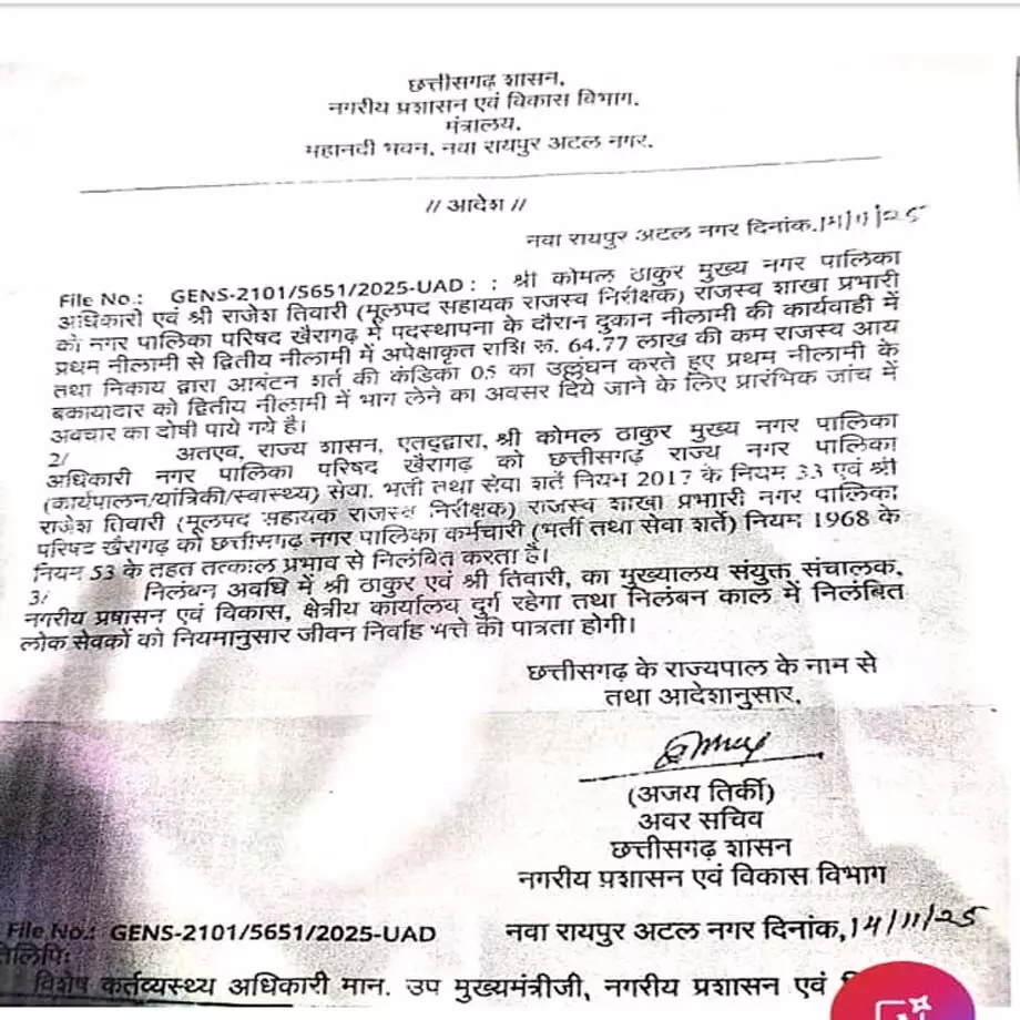 उच्च-स्तर पर शिकायत होने के बाद राज्य शासन ने कड़ा कदम उठाया है। नीलामी प्रक्रिया में नियमों के गंभीर उल्लंघन और आर्थिक अनियमितताओं की प्रारंभिक जांच में दोषी पाए जाने पर मुख्य नगर पालिका अधिकारी कोमल ठाकुर और राजस्व प्रभारी राजेश तिवारी को तत्काल प्रभाव से निलंबित किया है। निलंबन अवधि के दौरान इन दोनों अधिकारियों का मुख्यालय दुर्ग क्षेत्रीय कार्यालय निर्धारित किया गया है।