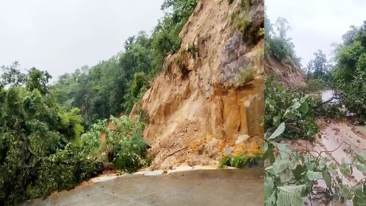 छत्तीसगढ़ में बड़ी लैंडस्लाइड: सतरेंगा-लेमरू मार्ग पर पहाड़ का बड़ा हिस्सा धसका, पत्थर-पेड़ गिरने से रास्ता बंद