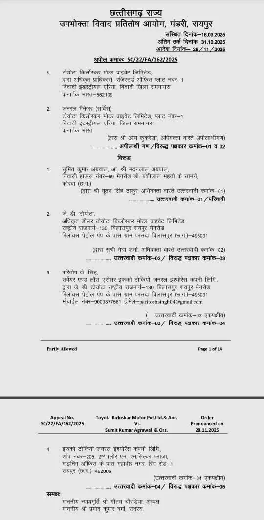 टोयोटा किर्लोस्कर मोटर कंपनी ने जिला आयोग के एकपक्षीय आदेश के खिलाफ छत्तीसगढ़ राज्य उपभोक्ता आयोग बिलासपुर में अपील की। मोटर कंपनी के अधिवक्ता ओम कुकरेजा ने एकपक्षीय फैसले पर आपत्ति की। इंश्योरेंस कंपनी की ओर से 12 लाख रुपए कार के रिपेयरिंग के लिए डीलर को दिया गया, एअर बैग खुलने के संबंध में विशेषज्ञ रिपोर्ट नहीं ली गयी और सुमित ने दुर्घटना को नहीं देखा।