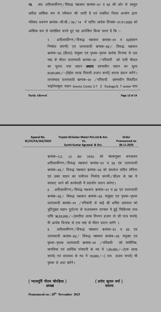 राज्य उपभोक्ता आयोग ने सुनाया फैसला: दुर्घटना में एयर बैग नहीं खुलने पर इनोवा को 61 लाख का जुर्माना