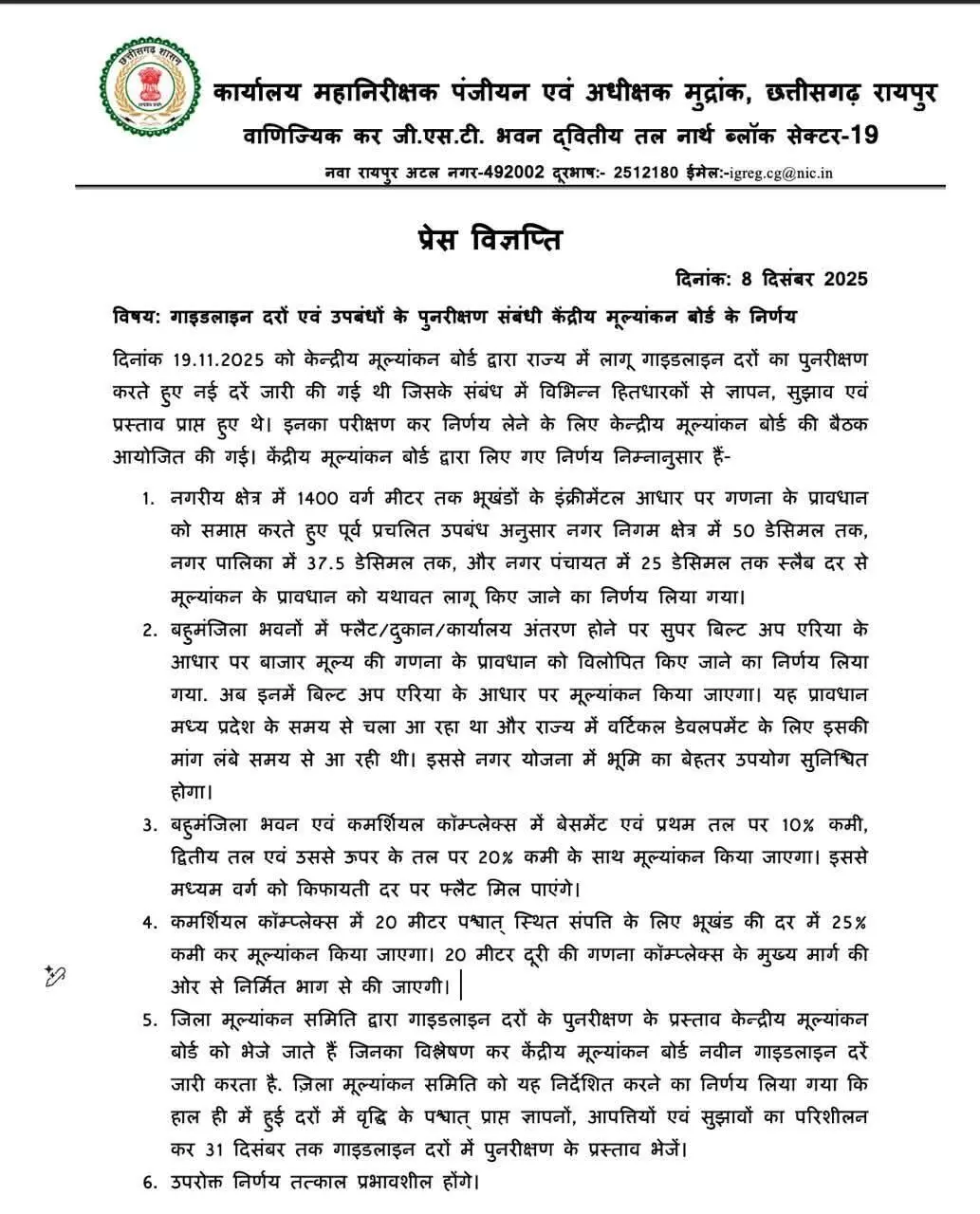 रायपुर। छत्तीसगढ़ में जमीन गाइडलाइन दरों को लेकर उपजे विवादों के बीच बड़ी खबर सामने आई है। कार्यालय महानिरीक्षक पंजीयन ने गाइडलाइन दरों में पुनरीक्षण को लेकर आदेश जारी किया है। जिसके अनुसार, शहरों में 1400 वर्गमीटर तक इंक्रीमेंटल गणना का प्रावधान खत्म हो जायेगा। वहीं नगर पालिका, नगर पंचायतों में पुराने प्रावधान लागू होंगे।