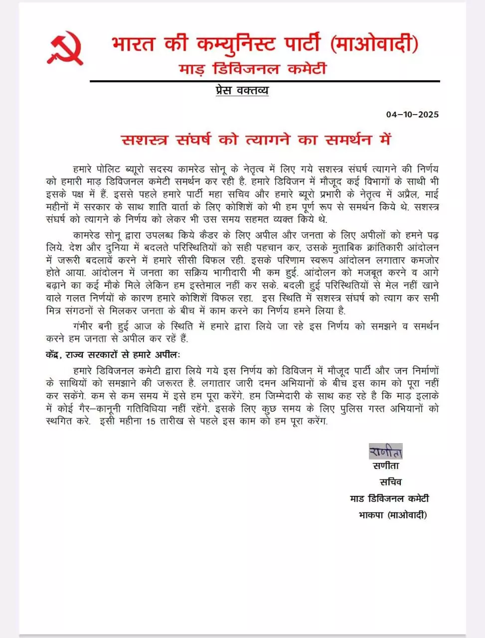 नक्सलियों ने कहा कि, हमारे पोलित ब्यूरो सदस्य कामरेड सोनू के नेतृत्व में लिए गए सशस्त्र संघर्ष त्यागने के निर्णय को हमारी माड़ डिवीजन कमेटी समर्थन करती है। हमारे डिवीजन में मौजूद कई विभागों के साथी भी इस पक्ष में है इससे पहले हमारे पार्टी के महासचिव और हमारे ब्यूरो प्रभारी के नेतृत्व में अप्रैल-मई महीना में सरकार के साथ शांति वार्ता के लिए कोशिशें को भी हम पूर्ण समर्थन दे रहे हैं। सशस्त्र संघर्ष को त्यागने के निर्णय को लेकर भी उस समय हम अपनी सहमति व्यक्त किए थे।