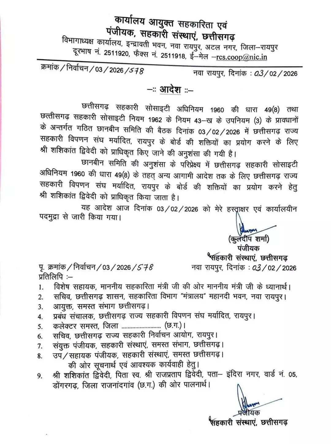 सहकारिता विभाग का बड़ा फैसला: छत्तीसगढ़ मार्कफेड के बोर्ड अधिकार अब शशिकांत द्विवेदी को सौंपे गए, आदेश जारी