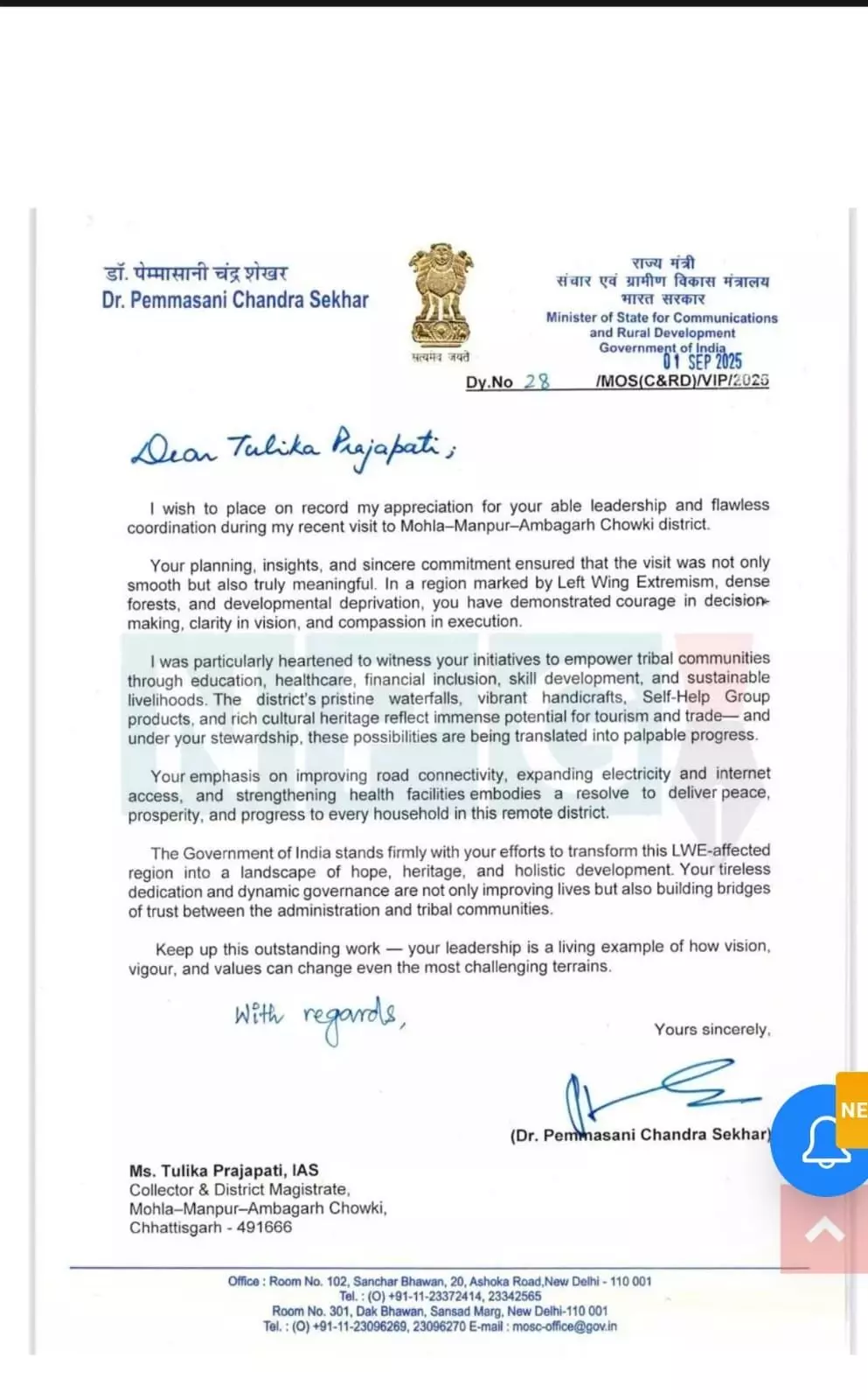 एनिशपुरी गोस्वामी- मोहला। संचार एवं ग्रामीण विकास केंद्रीय राज्य मंत्री डॉ. पेम्मासानी चंद्र शेखर ने IAS तुलिका प्रजापति की नक्सल प्रभावित मोहला-मानपुर-अंबागढ़- चौकी में विकास के प्रयासों की जमकर तारीफ़ की है। मंत्री ने अपने पत्र में यह भी लिखा कि घने जंगलों और नक्सल प्रभाव वाले इस इलाके में काम करना बेहद मुश्किल है, लेकिन IAS तुलिका ने साहस और साफ विजन के साथ यह कर दिखाया है।