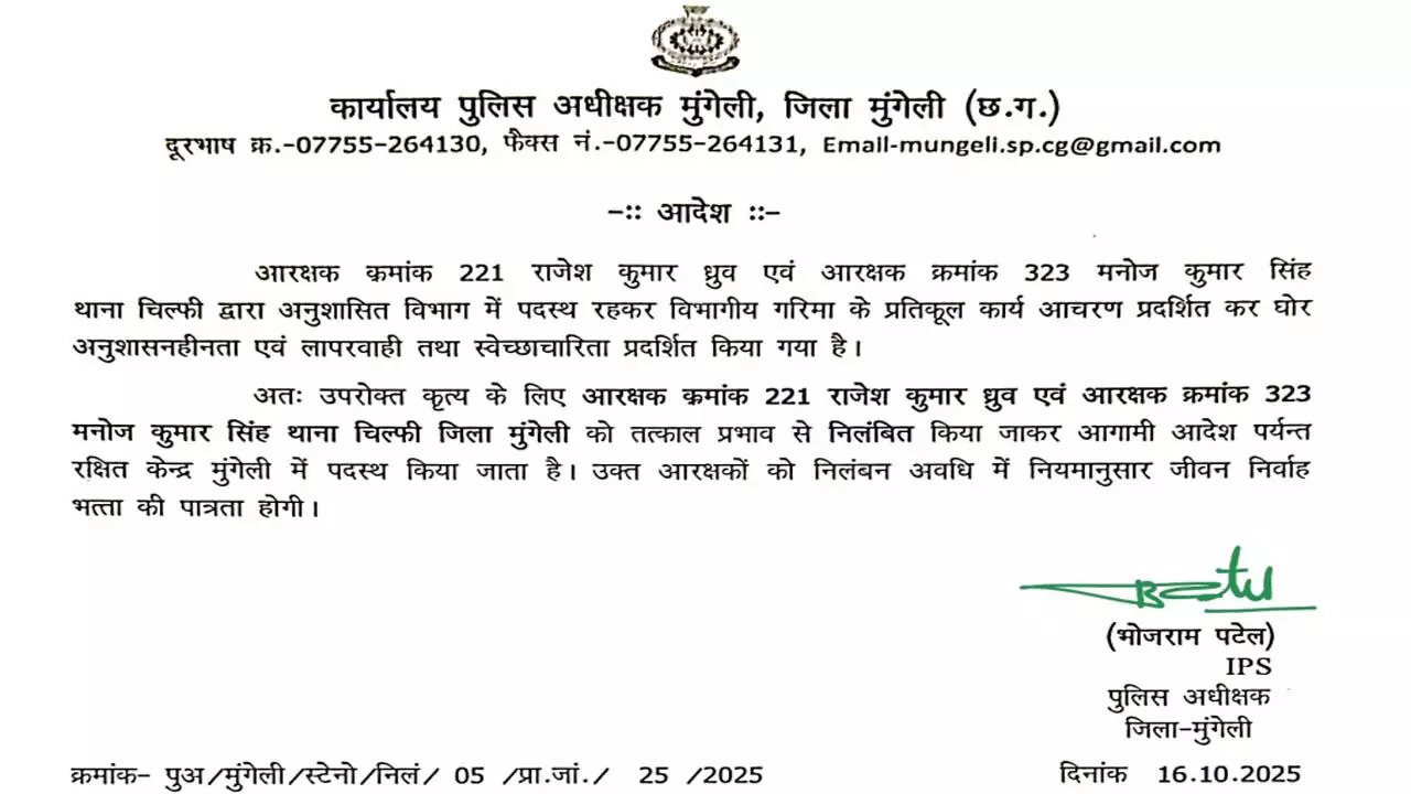'आरक्षक क्रमांक 221 राजेश कुमार ध्रुव, एवं आरक्षक क्रमांक 323 मनोज कुमार सिंह, थाना चिल्फी द्वारा विभागीय गरिमा के प्रतिकूल आचरण प्रदर्शित किया गया है, यह घोर अनुशासनहीनता एवं स्वेच्छाचारिता का परिचायक है। अतः दोनों आरक्षकों को तत्काल प्रभाव से निलंबित कर आगामी आदेश तक रक्षित केंद्र मुंगेली में पदस्थ किया जाता है।' जहाँ निलंबन अवधि में दोनों आरक्षकों को जीवन निर्वाह भत्ता प्रदान किया जाएगा, साथ ही एसडीओपी मयंक तिवारी को तीन दिवस के भीतर प्रारंभिक जांच रिपोर्ट प्रस्तुत करने के निर्देश दिए गए हैं।