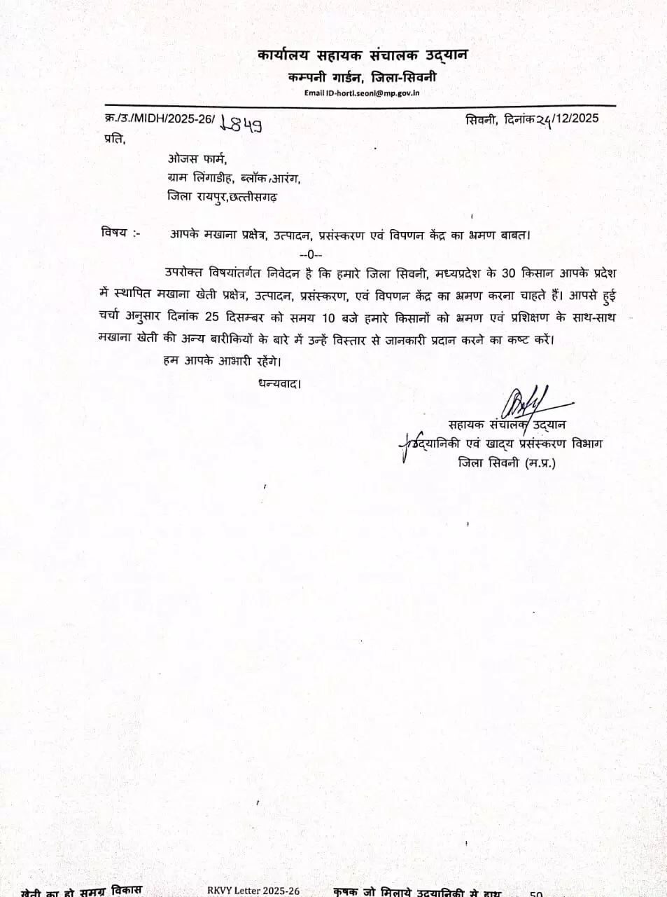 इसी क्रम में मध्य प्रदेश के सिवनी जिले से आए 30 किसानों के दल ने उद्यानिकी विभाग के मार्गदर्शन में आरंग स्थित ओजस फॉर्म का भ्रमण किया। किसानों ने खेत-स्तर पर उत्पादन से लेकर प्रोसेसिंग, पैकेजिंग और विपणन तक की संपूर्ण जानकारी प्राप्त की और अपने अनुभव साझा किए।