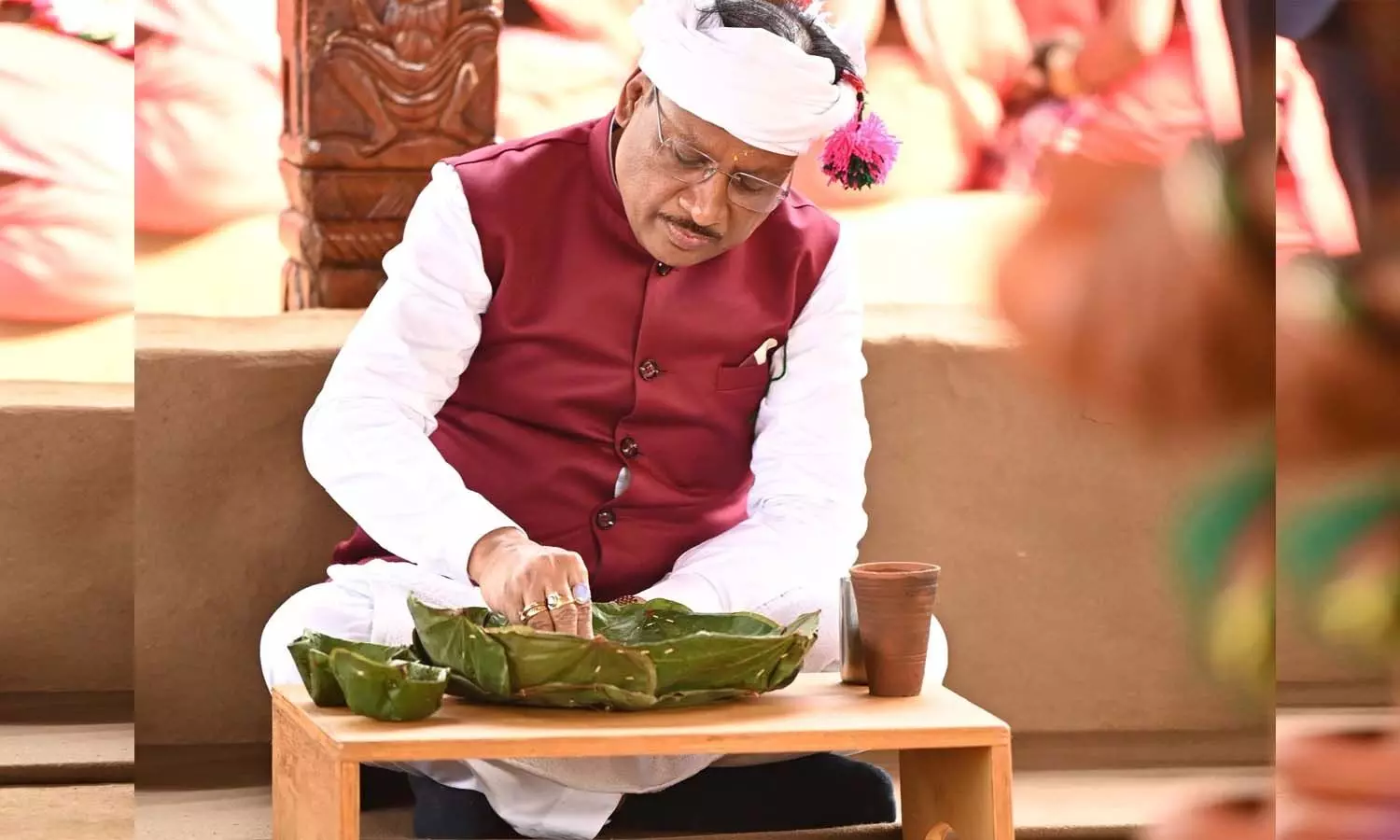 मुख्यमंत्री श्री साय ने घोटुल परिसर के लेय्योर एवं लेयोस्क कुरमा : युवाओं और युवतियों के लिए निर्मित कक्षों के साथ ही बिडार कुरमा : पारंपरिक वेशभूषा, प्राचीन वाद्ययंत्र एवं सांस्कृतिक सामग्रियों का संग्रह का निरीक्षण किया। इस दौरान ग्रामीणों की आग्रह पर मुख्यमंत्री श्री साय ने सगा कुरमा में बस्तर के पारंपरिक व्यंजनों का स्वाद लेकर क्षेत्र की खान-पान संस्कृति का सम्मान किया। इस दौरान मुख्यमंत्री के भोजन में विशेष रूप से भोजन गाटो-भात, कोदो-भात, उड़िद दार, हिरुवा दार, जीरा भाजी, कनकी पेज, भाजी घिरोल फुल, चाटी भाजी, कांदा भाजी, मुनगा भाजी, इमली आमट, मड़िया पेज, टमाटर चटनी, चिला रोटी, रागी कुरमा, रागी केक, रागी लट्टू, रागी जलेबी परोसा गया।