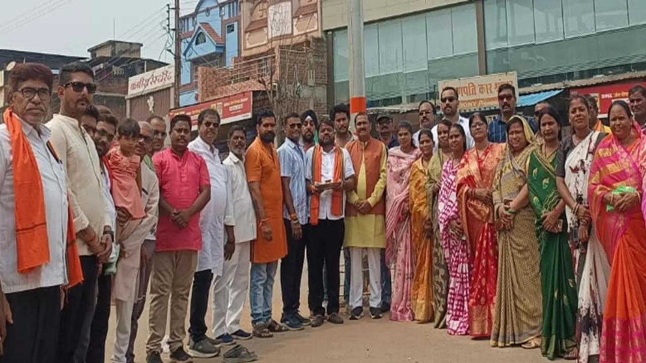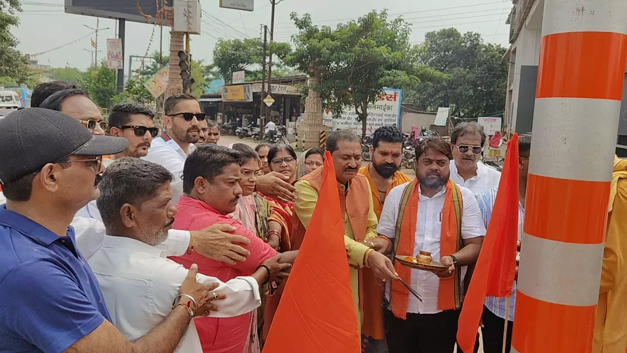 भगवा ध्वज की पूजा करते हुए विधायक साहू और अन्य जनप्रतिनिधि
