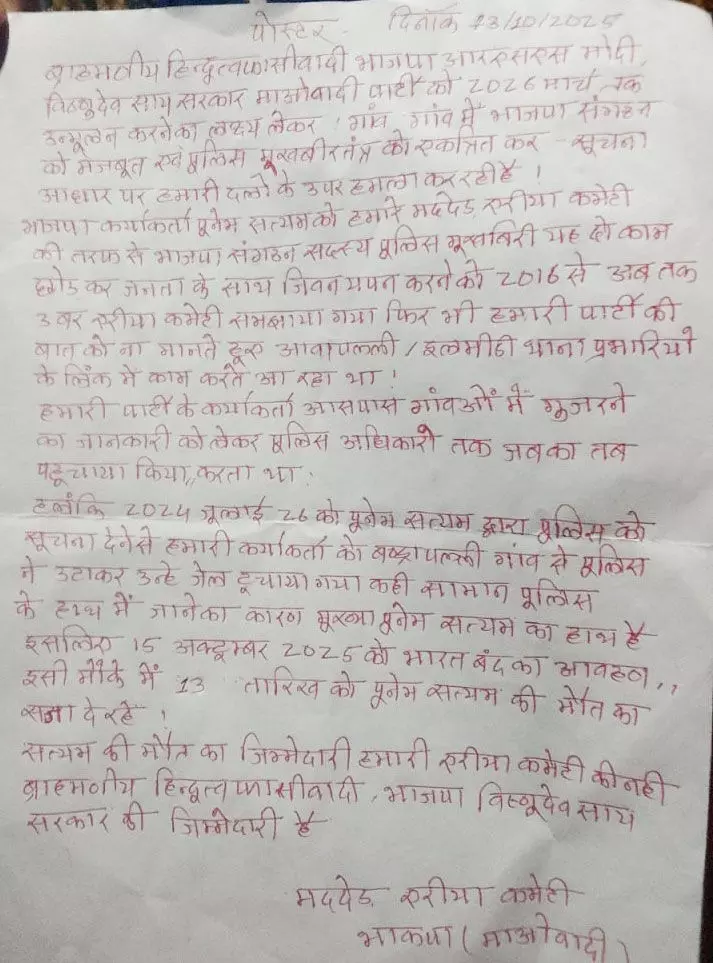2024 जुलाई 26 को पूनेम सत्यम के पुलिस को सूचना देने के कारण हमारे पार्टी के कार्यकर्ता को पुलिस उठाकर ले गई। हमारे कई सामान का पुलिस के हाथों में जाने के पीछे पूनेम सत्यम का ही काम है। इसलिए 15 अक्टूम्बर 2025 को भारत बंद का आह्वाहन करते हुए पूनेम सत्यम को मौत की सजा दे रहे हैं। उन्होंने आगे लिखा- सत्यम की मौत का जिम्मेदार एरीया कमेटी नहीं बल्कि ब्राहमणीय हिन्दूत्व, फासीवादी, भाजपा विष्णुदेव साय सरकार है।
