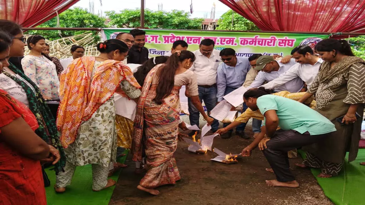 बर्खास्तगी के बाद NHM कर्मियों का फूटा गुस्सा: आदेश की प्रतियां जलाकर जताया विरोध, पिछले 18 अगस्त से कर रहे हैं हड़ताल
