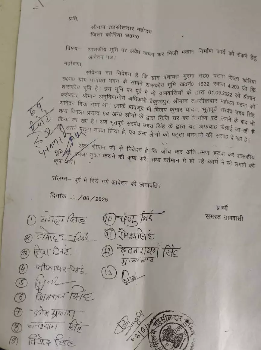 शिकायतकर्ता ने आरोप लगाया कि, वर्तमान जनपथ पंचायत अध्यक्ष जब ग्राम पंचायत मुरमा के सरपंच पद पर थे। तब इन्होंने शासकीय भूमि जिसका खसरा नंबर 1532 है और रकबा 4.200 है अवैध तरीके से ग्राम सभा का प्रस्ताव पारित करते रिश्ते में अपनी सास के नाम दर्ज करा लिया था। जिसकी शिकायत ग्राम वासियों के 1 सितंबर 2022 में पटना तहसील में किया गया था। जिसके बाद तहसीलदार के ने निर्माणकार्य कराने में स्टे लगा दिया था।