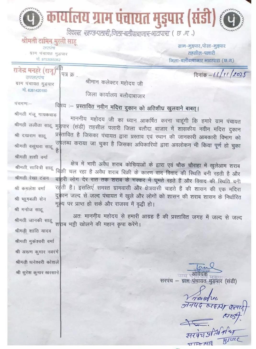 साहब... इससे अच्छा तो गांव में शराब दुकान ही खुलवा दीजिए: अवैध बिक्री से परेशान ग्रामीणों का बलौदाबाजार कलेक्टर को पत्र