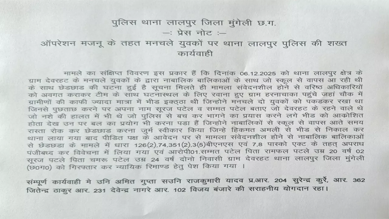 पीड़ित पक्ष की शिकायत पर दोनों युवकों के खिलाफ पॉक्सो एक्ट की धारा के तहत अपराध दर्ज कर विवेचना में लिया गया है। पुलिस ने दोनों आरोपियों- सम्मत पटेल (20 वर्ष) और सूरज पटेल (24 वर्ष) को को गिरफ्तार कर न्यायिक रिमांड पर भेज दिया है। पुलिस ने स्पष्ट किया है कि, क्षेत्र में ऐसे मनचलों पर लगातार निगरानी रखी जा रही है और ऑपरेशन मजनू के तहत छेड़छाड़ की किसी भी घटना पर तुरंत सख्त कार्रवाई की जाएगी।