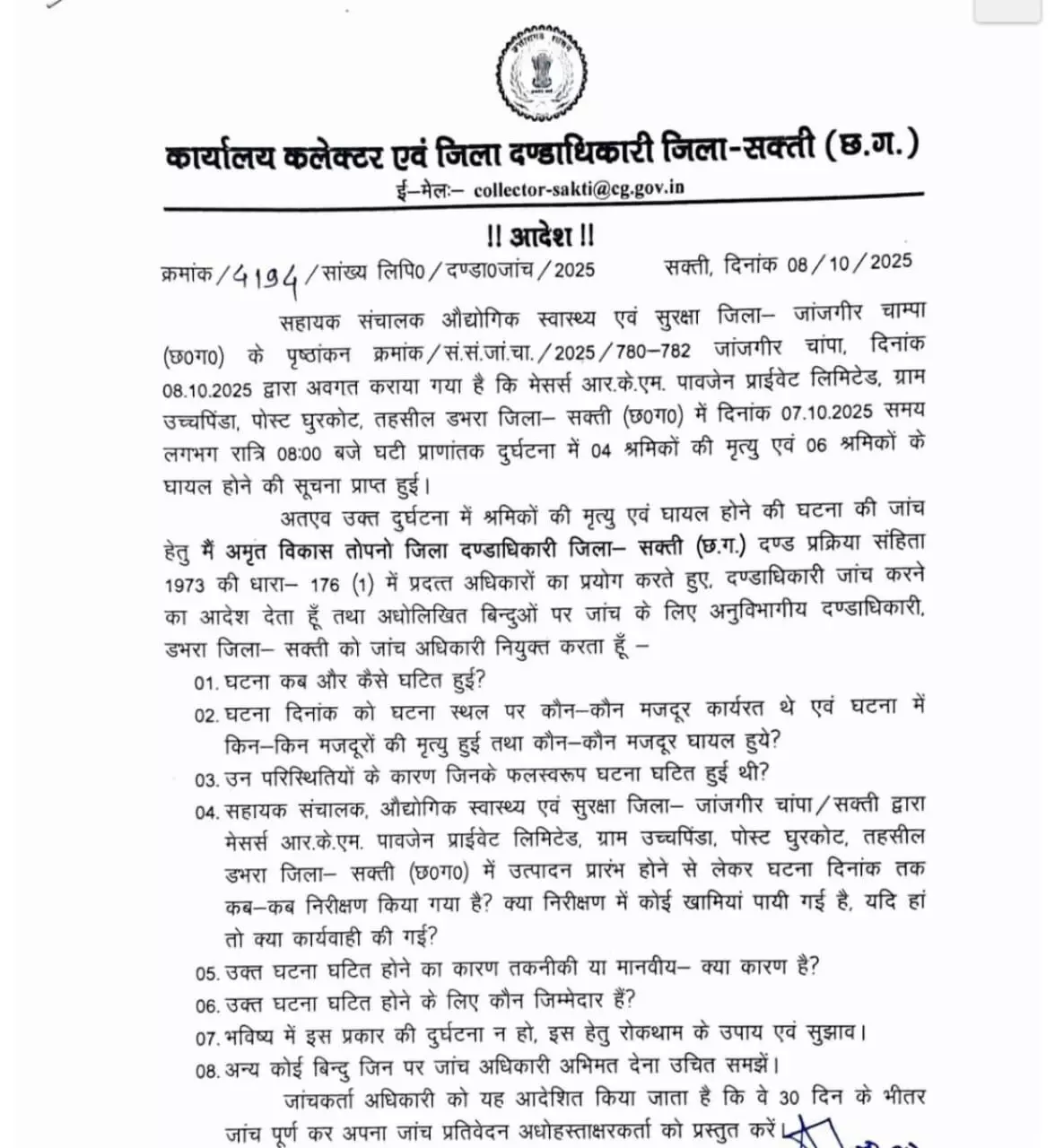 RKM पॉवर प्लांट की लापरवाही मामले में SP अंकिता शर्मा ने ऑनर डॉ. अंडल अरमुगम समेत प्रबंधन के अधिकारियों खिलाफ गंभीर लापरवाही एवं सुरक्षा मानकों का उल्लंघन पाए जाने पर BNS की धारा 106(1), 289, 3(5) के तहत केस दर्ज कर लिया है। वहीं कलेक्टर ने घटना की जांच के लिए टीम गठित कर दी है। जिसमें डभरा SDM बालेश्वर राम को जांच अधिकारी बनाया गया है। कलेक्टर ने 30 दिवस के भीतर जांच रिपोर्ट प्रस्तुत करने के निर्देश दिए हैं।