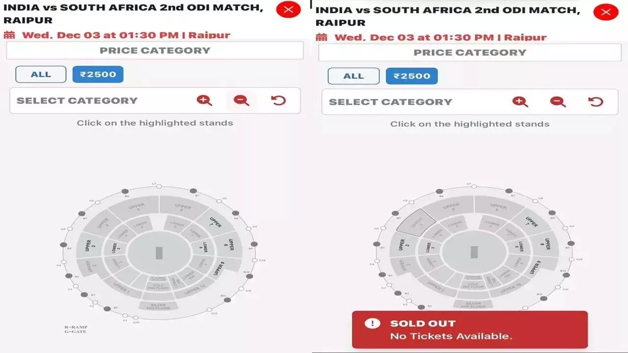 छत्तीसगढ़ की राजधानी रायपुर स्थित शहीद वीर नारायण सिंह इंटरनेशनल क्रिकेट स्टेडियम में 3 दिसंबर को भारत और दक्षिण अफ्रीका के बीच वन डे इंटरनेशनल मैच खेला जाना है। इस मैच के लिए टिकट बिक्री 22 नवंबर की शाम पांच बजे से आनलाइन शुरू हुई। हैरानी की बात यह है कि, बिक्री शुरू होने के मात्र 15 मिनट बाद ही टिकट बिक्री करने वाले वेबसाइट ने सोल्ड आउट दिखाना शुरू कर दिया।