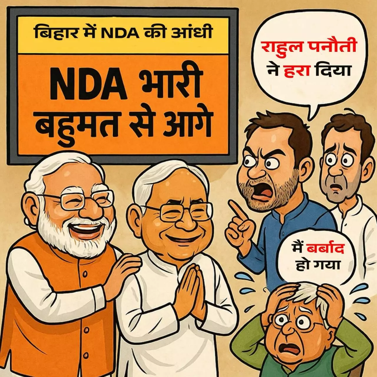बिहार विधानसभा चुनाव में मतगणना NDA को बढ़त मिलने पर BJP ने कार्टून पोस्टर जारी कर राहुल गांधी को पनौती बताया। वहीं NDA को आंधी बताया है। बिहार चुनाव परिणाम में NDA ऐतिहासिक जीत की ओर अग्रसर है। वहीं राजधानी रायपुर में भाजपा कार्यालय में भारी जश्न का माहौल है। बीजेपी के प्रदेश प्रवक्ता अमित चिमनानी, उज्ज्वल दीपक जिलाध्यक्ष रमेश सिंह ठाकुर, जिला महामंत्री अमित मेशरी, गुंजन प्रजापति सहित महिला नेत्रियों ने जमकर डांस किया।