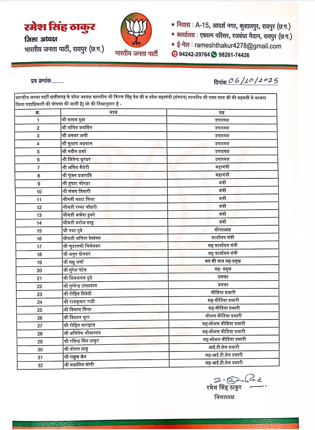 रायपुर के भाजपा के जिला पदाधिकारियों की घोषणा कर दी गई है। सत्यम दुआ की अगुवाई में 32 नेताओं को जिला भाजपा की टीम में जगह दी है।