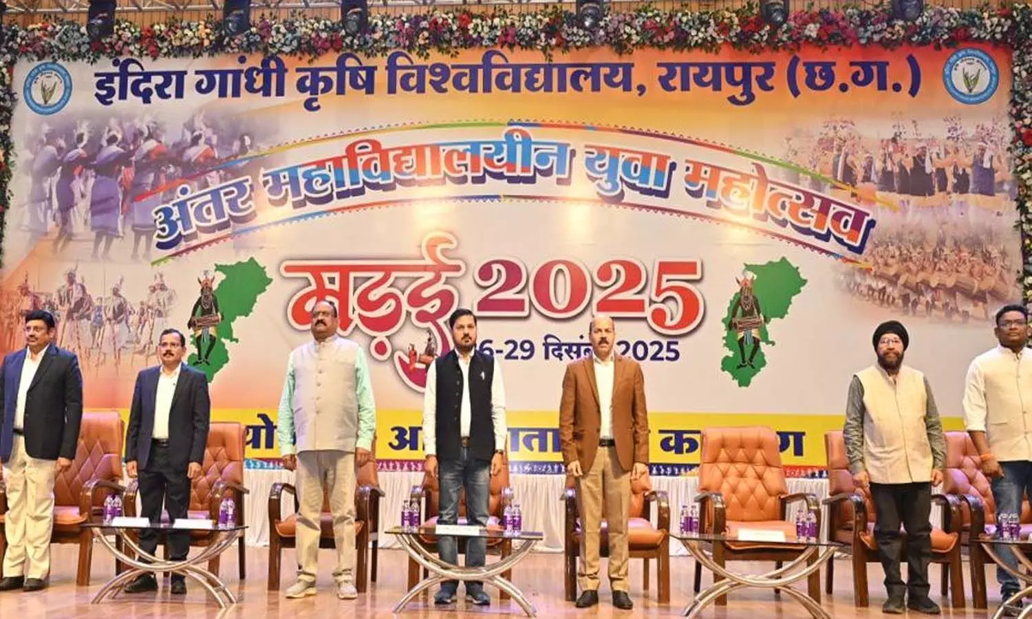 रायपुर। धरसींवा विधानसभा के जोरा स्थित इंदिरा गांधी कृषि विश्वविद्यालय के रायपुर परिसर में आज अंतर महाविद्यालयीन युवा महोत्सव 'मड़ई-2025' का भव्य आयोजन हुआ। कार्यक्रम का शुभारंभ मुख्य अतिथि विधायक अनुज शर्मा ने किया। महोत्सव में प्रदेशभर के महाविद्यालयों से आए सैकड़ों छात्रों ने लोकनृत्य, संगीत, साहित्य, नाट्य एवं ललित कला की विविध प्रस्तुतियों से मंच को जीवंत कर दिया।