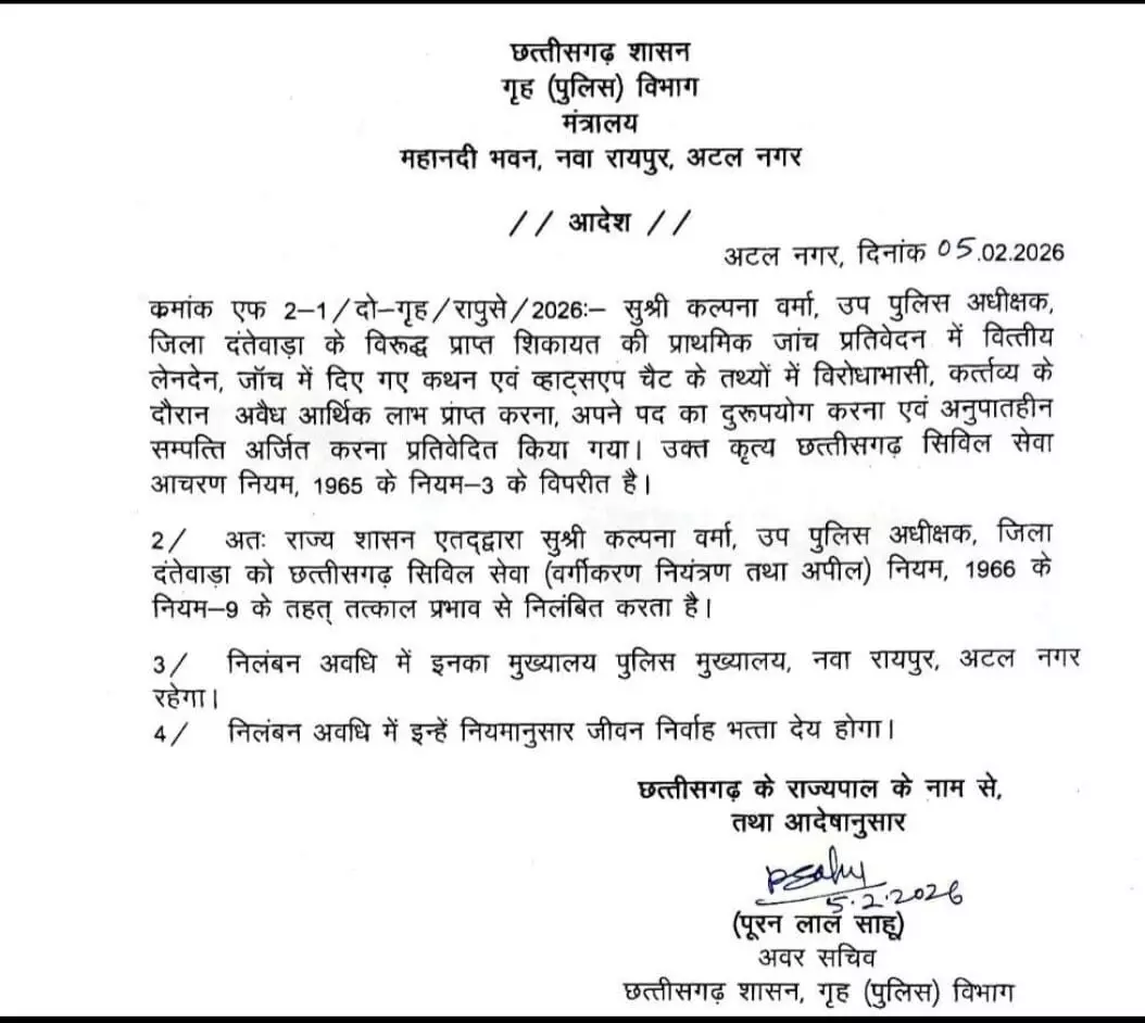 रायपुर। बहुचर्चित डीएसपी कल्पना वर्मा बनाम दीपक टंडन केस में नया मोड़ सामने आया है। इस मामले में गुरुवार को आदेश जारी कर उन्हें सस्पेंड कर दिया गया है। शिकायत की प्राथमिक जांच प्रतिवेदन में वित्तीय लेनदेन, जांच में दिए गए कथन एवं व्हाट्सएप चैट के तथ्यों में विरोधाभासी, कर्तव्य के दौरान अवैध आर्थिक लाभ प्राप्त करना, अपने पद का दुरूपयोग करना एवं अनुपातहीन सम्पत्ति अर्जित करना पाया गया। उक्त कृत्य छत्तीसगढ़ सिविल सेवा आचरण नियम, 1965 के नियम-3 के विपरीत है। जिसके बाद उन्हें सस्पेंड कर दिया गया है।