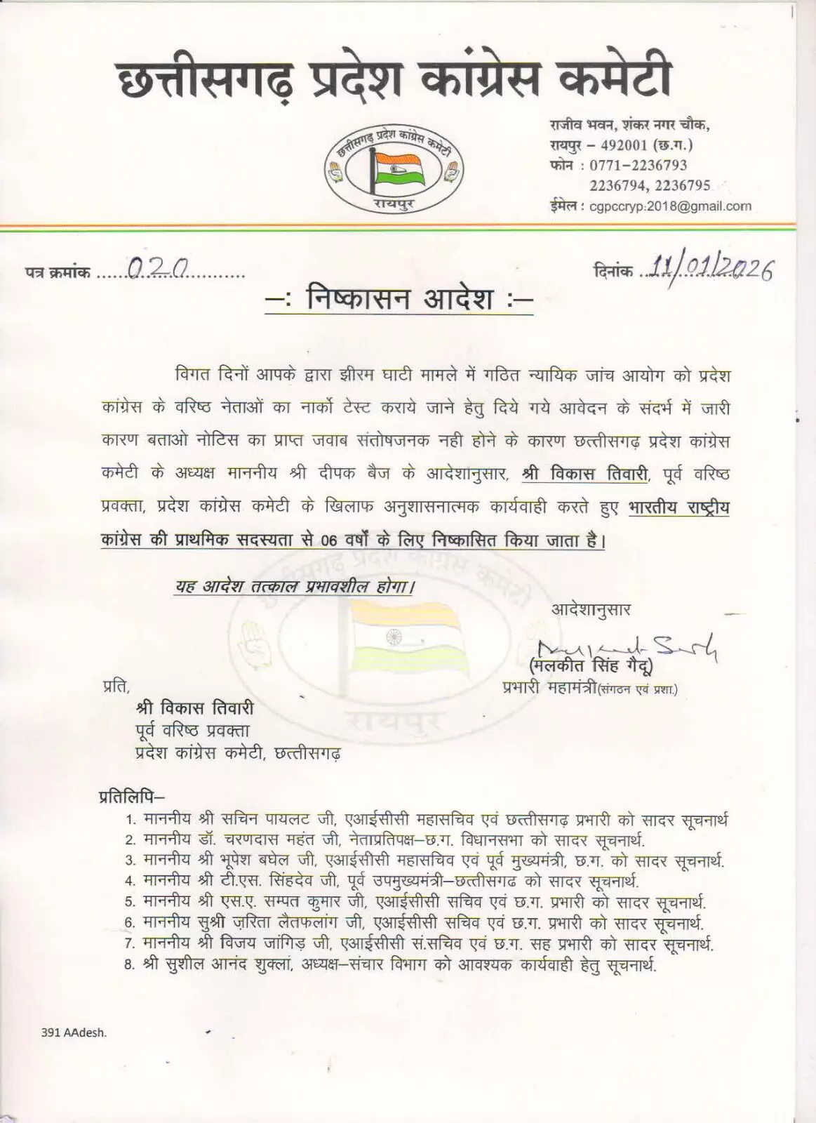 झीरम कांड पर बयानबाजी पड़ी महँगी: कांग्रेस के पूर्व प्रवक्ता विकास तिवारी पार्टी से 6 साल के लिए निष्कासित